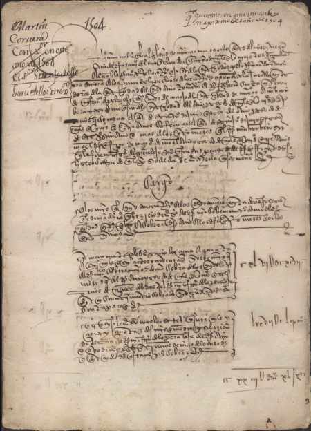 Contiene:Fol. 1r. Toma de razón 8 de julio de 1505 ante Garci Tello, corregidor, Francisco de Palazol, escribano, y los contadores Lope Alfonso de Lorca, regidor, y Cristobal Salar, jurado. "...los maravedíes que...reçibió e cobró..." Fol. 3r. "Los maravedíes que...dio e gastó e despendió..."Los asientos de los ingresos y gastos del concejo del mayordomo Martín de Corvera.