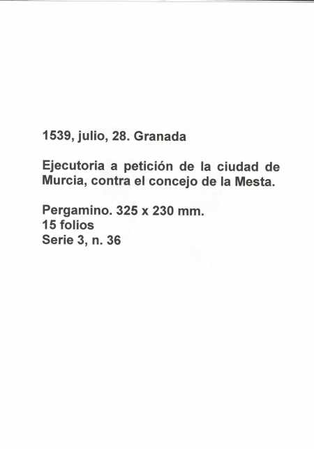 Ejecutoria, a petición de la ciudad de Murcia, contra el Consejo de la Mesta, sobre el aprovechamiento de los pastos concejiles y pago de derechos.