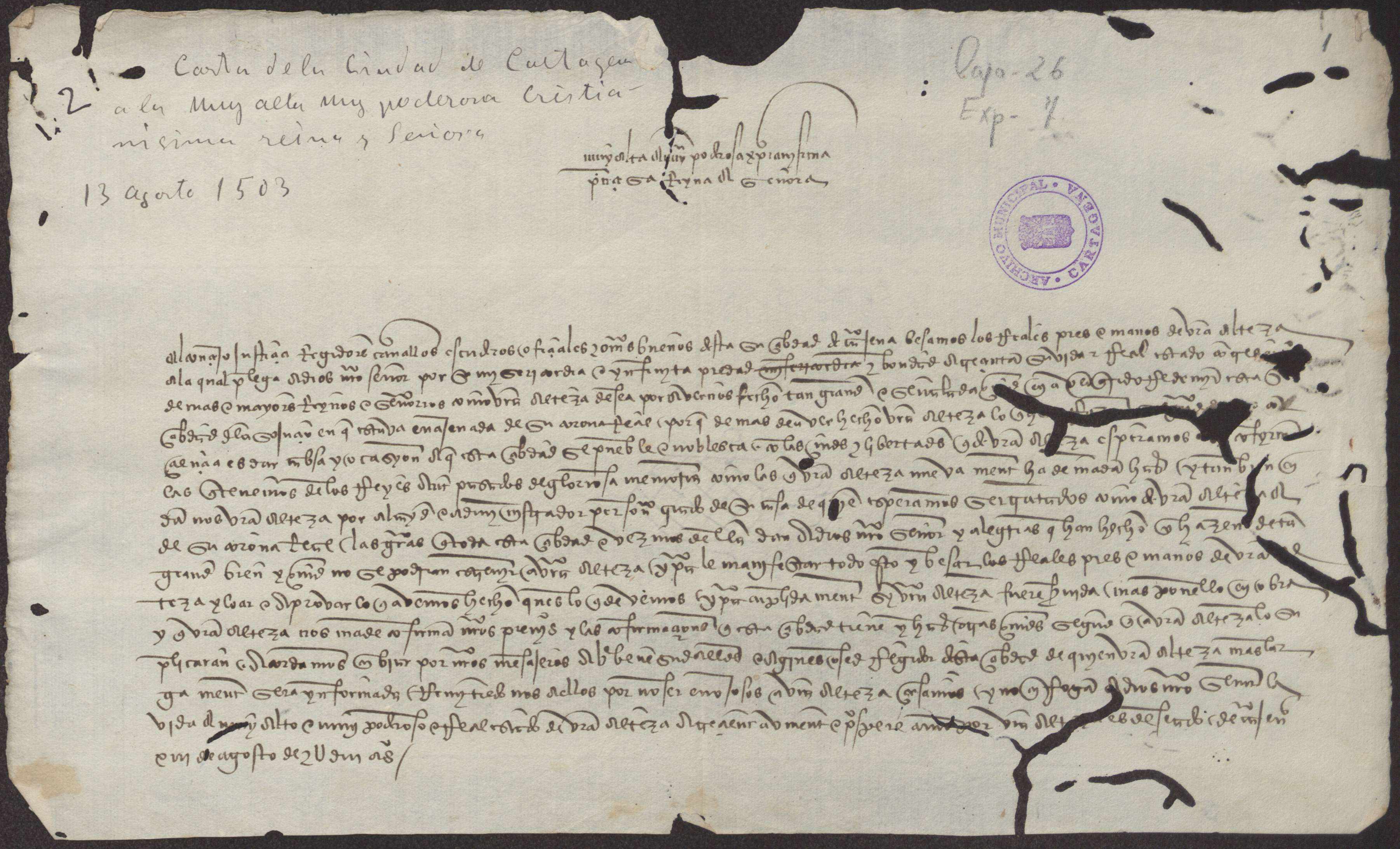 Carta del Concejo de Cartagena a Isabel la Católica solicitando la confirmación de los privilegios que la ciudad tiene de reyes anteriores.