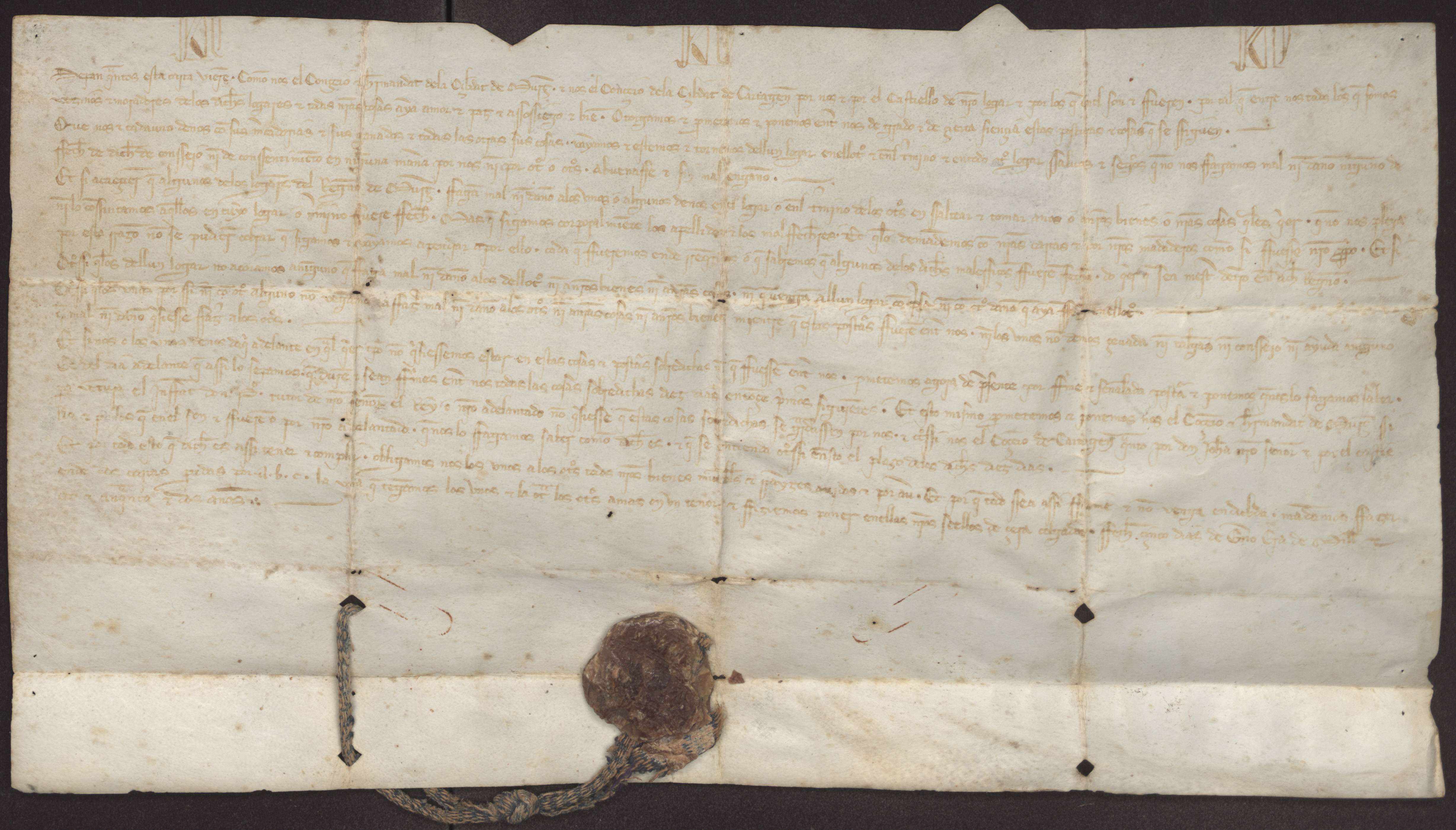 El concejo y Hermandad de la ciudad de Murcia y el concejo de Cartagena acuerdan el libre movimiento de sus vecinos en ambos términos concejiles, y no reciban ningún tipo de daño en sus personas o bienes.