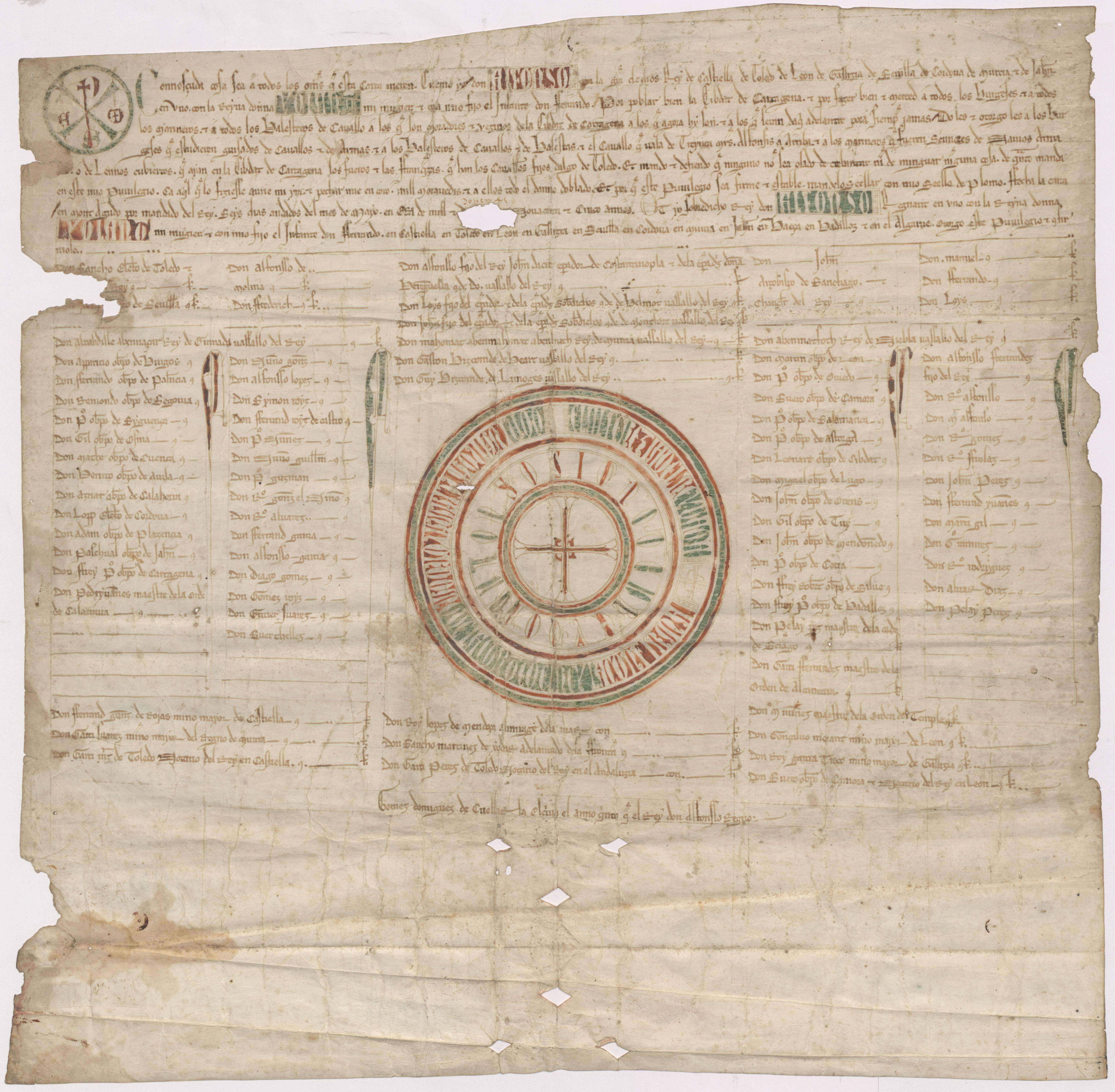 Privilegio rodado de Alfonso X a la ciudad de Cartagena confirmando privilegios y franquezas anteriores.