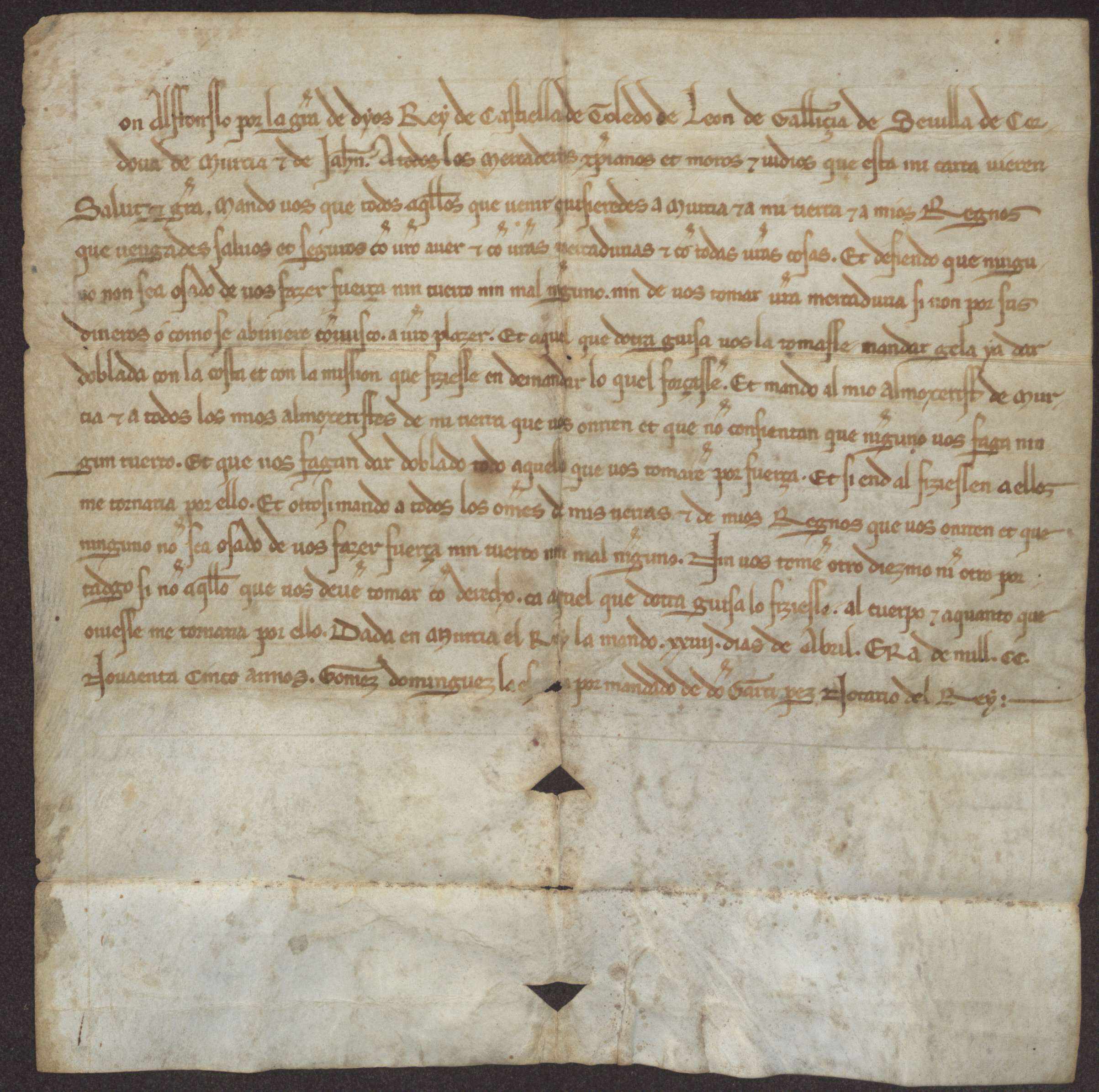 Alfonso X comunica a todos aquellos mercaderes cristianos, moros y judíos que pueden acudir al Reino de Murcia a comerciar con sus productos, asegurando que tanto sus personas como sus posesiones serán defendidas en todo momento. Igualmente, ordena a los almojarifes y demás recaudadores del Reino que cobren solamente los derechos establecidos.