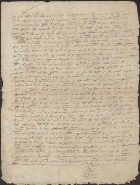 Faltan el inicio y el final del documento. El maestre de Santiago se obliga a no ir contra lo acordado. Y el rey restituye, con todos sus derechos , al Infante Enrique de Aragón como mastre de la Orden de Santiago.