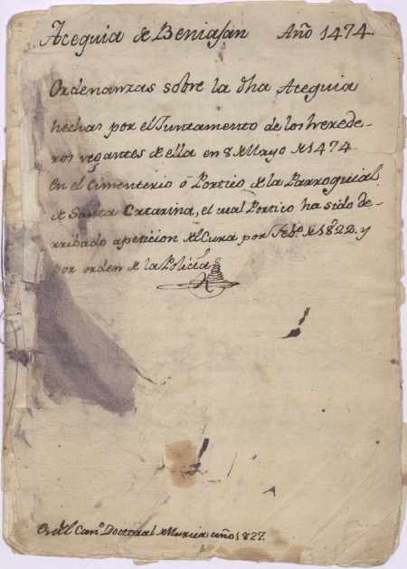 Contiene las ordenanzas acordadas en el juntamento de 1474-5-8 para el reparto y uso del agua en la huerta, viñas y campo de de Beniaján.Folios 2 r-4 v original del siglo XVFolios 6 r-9 v copia del siglo XIX