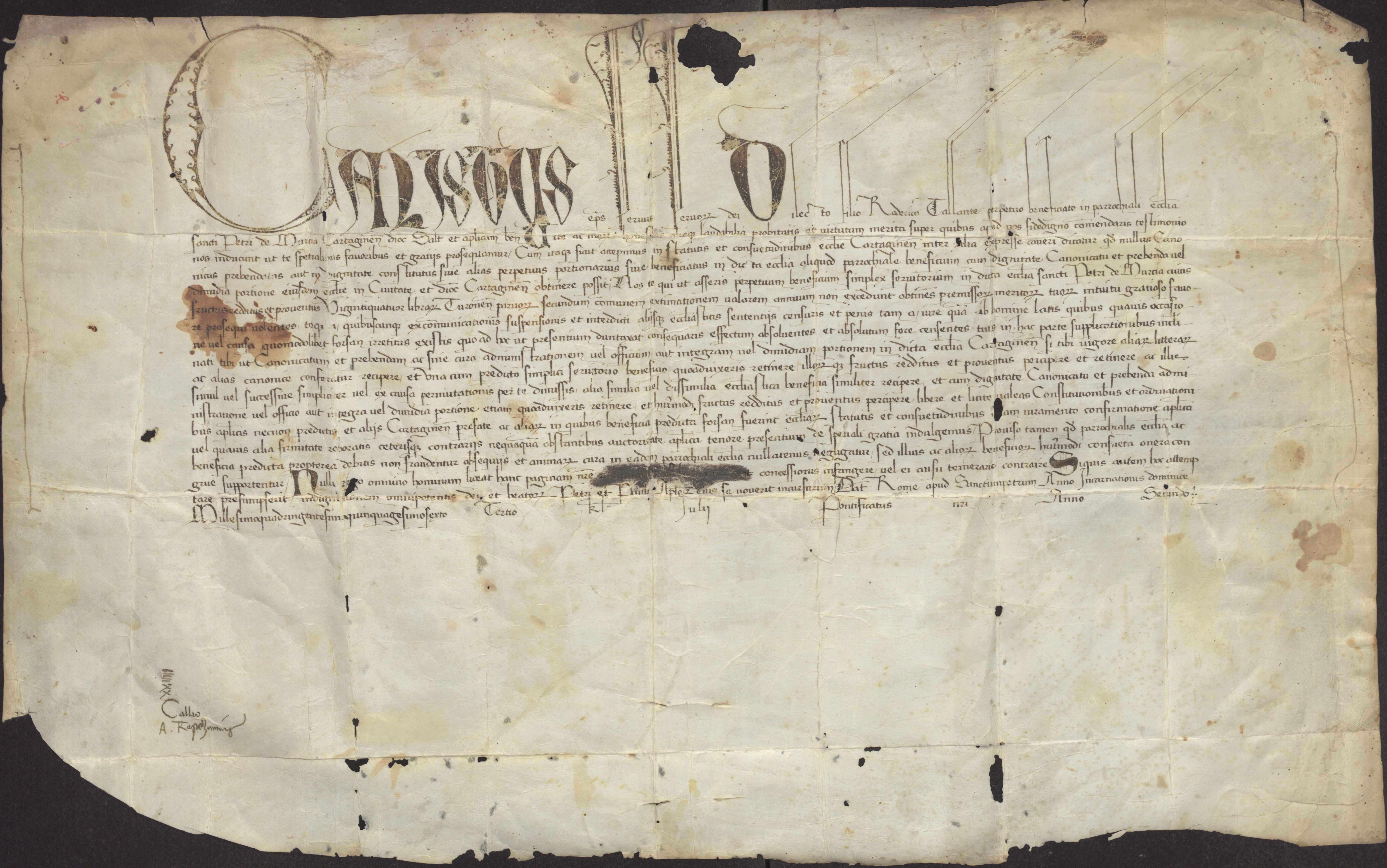 Calixto III concede una bula a Rodrigo Tallante, clérigo de la iglesia de San Pedro de Murcia, eximiéndole de la prohibición a los religiosos de tener más de un beneficio, pudiendo gozar en su caso de un beneficio de hasta 24 libras.