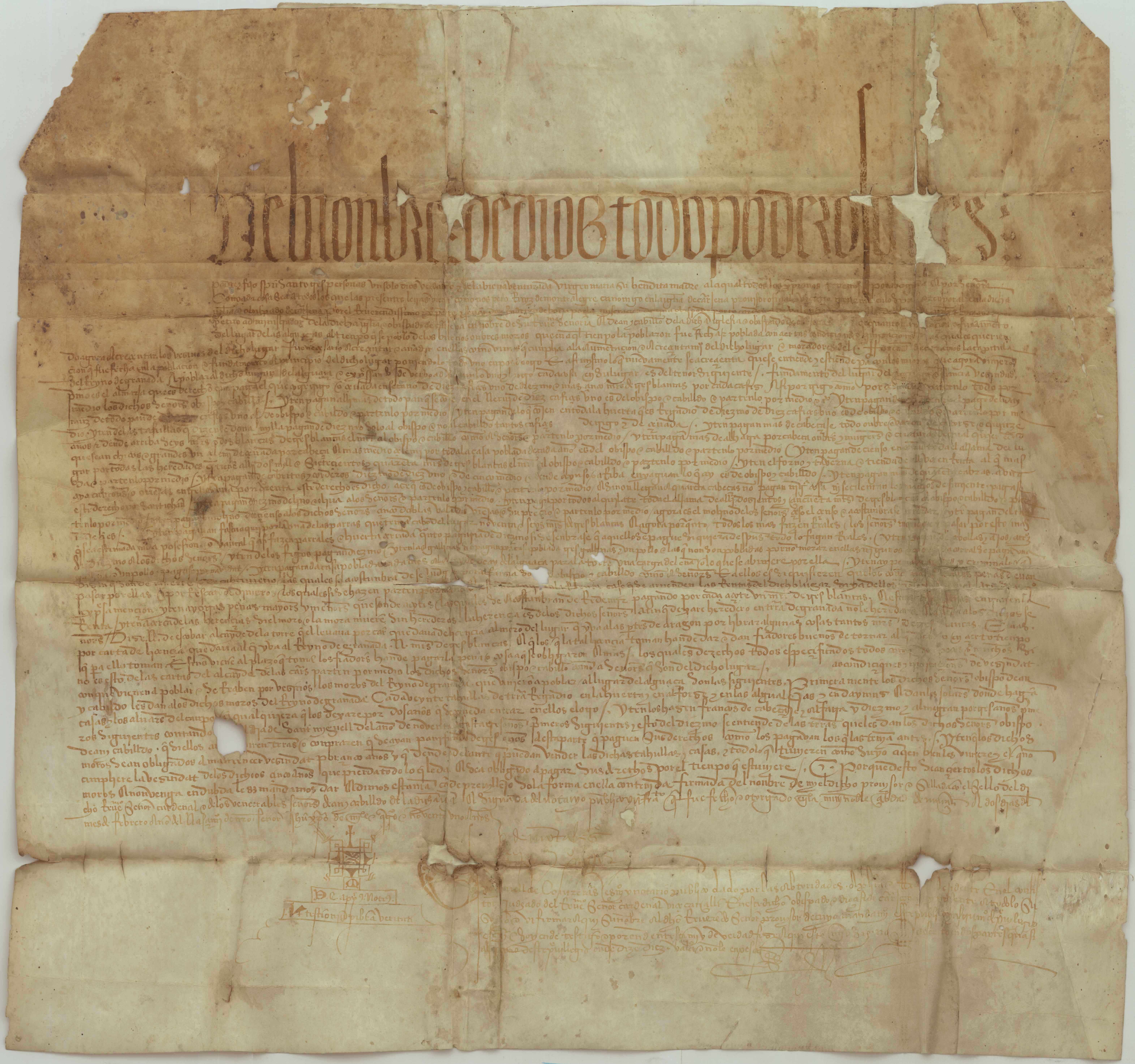 Carta de población de Alguazas otorgada por el Obispo de Cartagena. Estipula lo referente al pago del diezmo sobre trigo y cebada, horno, tiendas, taberna, ganado o huerta. Estas disposiciones se extienden también a los moros que desde el Reino de Granada han acudido a poblar Alguazas.
