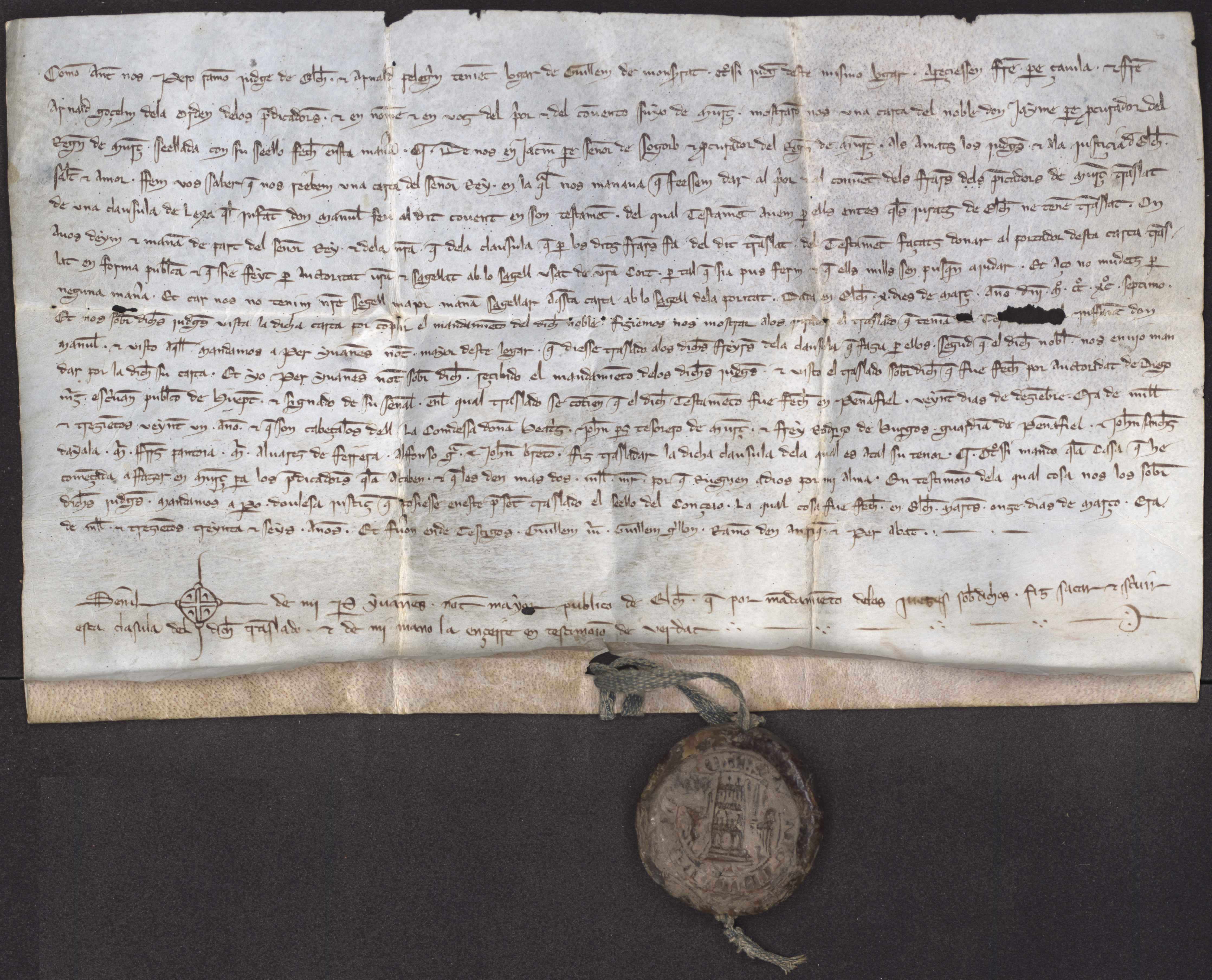 Testimonio notarial de la entrega de una claúsula del testamento del infante don Manuel hecha por Pedro Ramón, juez de Elche, y Arnald Pelegrín, lugarteniente del juez Guillem de Montserrat, a los frailes de la Orden de los Predicadores de Murcia. Incluye:- Carta de Jaime Pérez, procurador general del Reino de Murcia a los alcaldes de Elche, ordenando dar traslado a los frailes de la Orden de los Predicadores de Murcia de una claúsula del testamento del infante don Manuel (1297-3-10. Elche).- Claúsula del testamento del infante don Manuel, ordenando concluir la casa de estos frailes en Murcia y concederles 2.000 maravedís para que rueguen por su alma. (1283-12-20. Peñafiel).