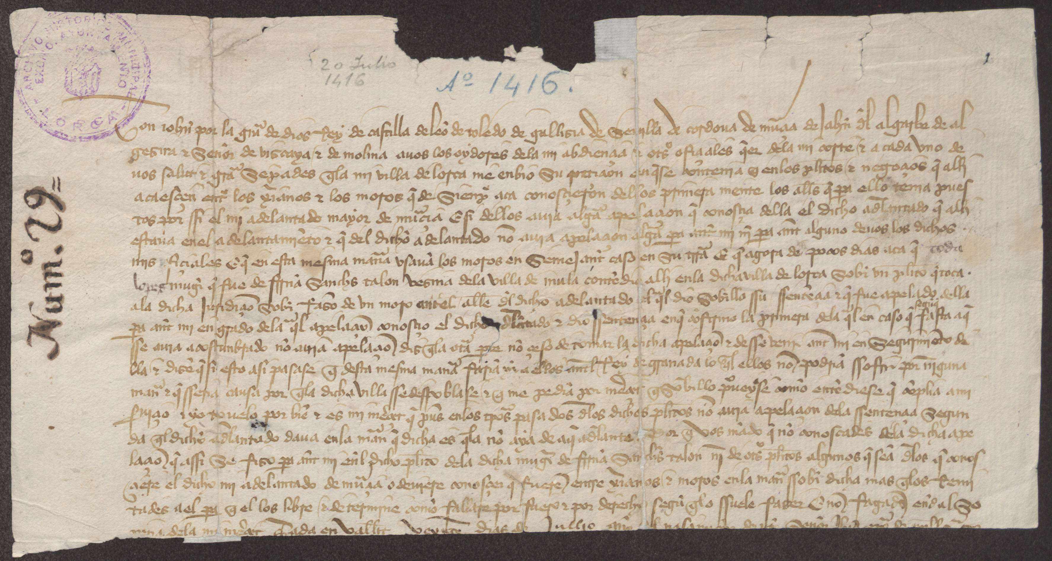 Juan II, ante las quejas de Lorca, ordena a los oidores de la Audiencia que no se admitan a trámite juicios entre moros y cristianos, que corresponde resolver a los alcaldes y en última instancia al adelantado de Murcia.Falta la parte final del documento.