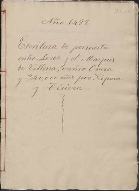 Escritura de permuta entre Lorca y el marqués de Villena de Overa y 340.000 maravedíes por Xiquena y Tirieza.