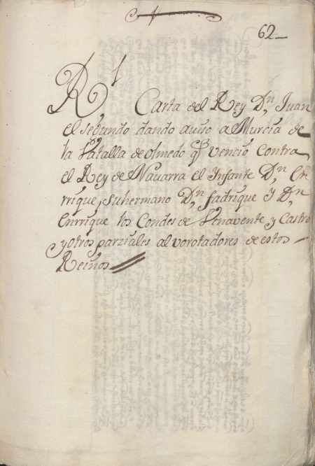 Juan II comunica al concejo de Murcia la victoria conseguida frente al rey de Navarra, el infante Enrique y sus secuaces en la batalla de Olmedo.