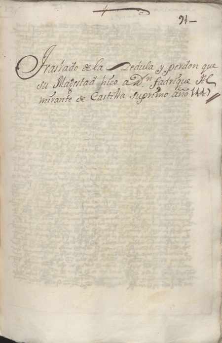 Juan II perdona a su primo D. Fadrique, a su familia y partidarios todas las penas en las que hubieran incurrido, con ciertas condiciones y exceptuando del perdon al comendador Rodrigo Manrique.