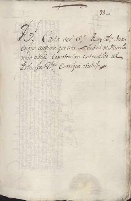 Juan II manda al concejo de Murcia que den fe y creencia a Diego de Ribera, corregidor de Murcia, que llegará próximamente a la ciudad para desmentir los rumores que aseguraban que el rey había concedido a su hijo el príncipe D. Enrique la ciudad de Murcia como merced.