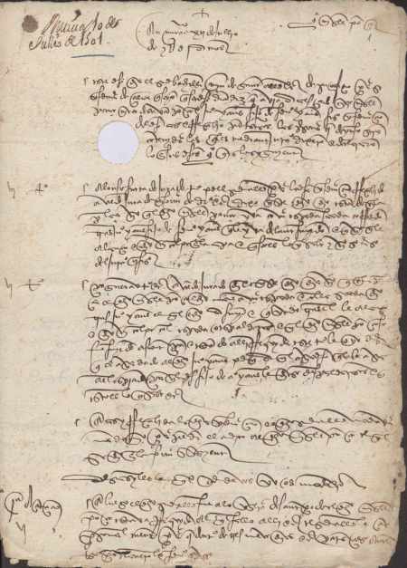 Expediente del proceso contra Miguel Ponce, acusado de atacar con una espada a Juan Yáñez, llevado a cabo por el alcalde Martín de Gante. El documento contiene:- Declaración de los testigos Alfonso Hurtado y Pedro Guerau, que manifiestan que vieron en la calle a Miguel Ponce persiguiendo y atacando con una espada a Juan Yáñez. El alcalde acude a la Iglesia de San Pedro, donde se encuentra refugiado Miguel Ponce, y le ordena que se presente ante él en el plazo de varios días (1501-7-12. Murcia). Fol. 1r- Miguel Ponce no se presenta ante el alcalde, por lo cual éste lo acusa de rebeldía. (1501-7-20. Murcia). Fol. 1v- El alcalde vuelve a acusarlo de rebeldía. (1501-7-21. Murcia). Fol. 1v- Juan Yáñez, al ser preguntado por el alcalde si desea querellarse, responde que no. (1502-7-25. Murcia). Fol. 1v- Alfonso de la Peña, alguacil, manifiesta haber apresado a Miguel Ponce. (1502-1-26. Murcia). Fol. 1v- Comparecencia de Miguel Ponce ante el alcalde. (1502-1-29. Murcia). Fol. 1v- Prosigue el juicio contra Miguel Ponce, acusado por el fiscal Álvaro de Solís de haber atacado a Juan Yáñez. (1502-1-31. Murcia). Fol. 1v- Miguel Ponce niega en un primer momento esta acusación. (1502-2-4. Murcia). Fol. 2r- Álvaro de Solís prueba la acusación contra Miguel Ponce, y éste finalmente confiesa. (1502-2-21. Murcia). Fol. 2r- Sentencia del alcalde Martín de Gante. Condena a Miguel Ponce a destierro de la ciudad durante dos meses. (1502-2-22. Murcia). Fol. 2v