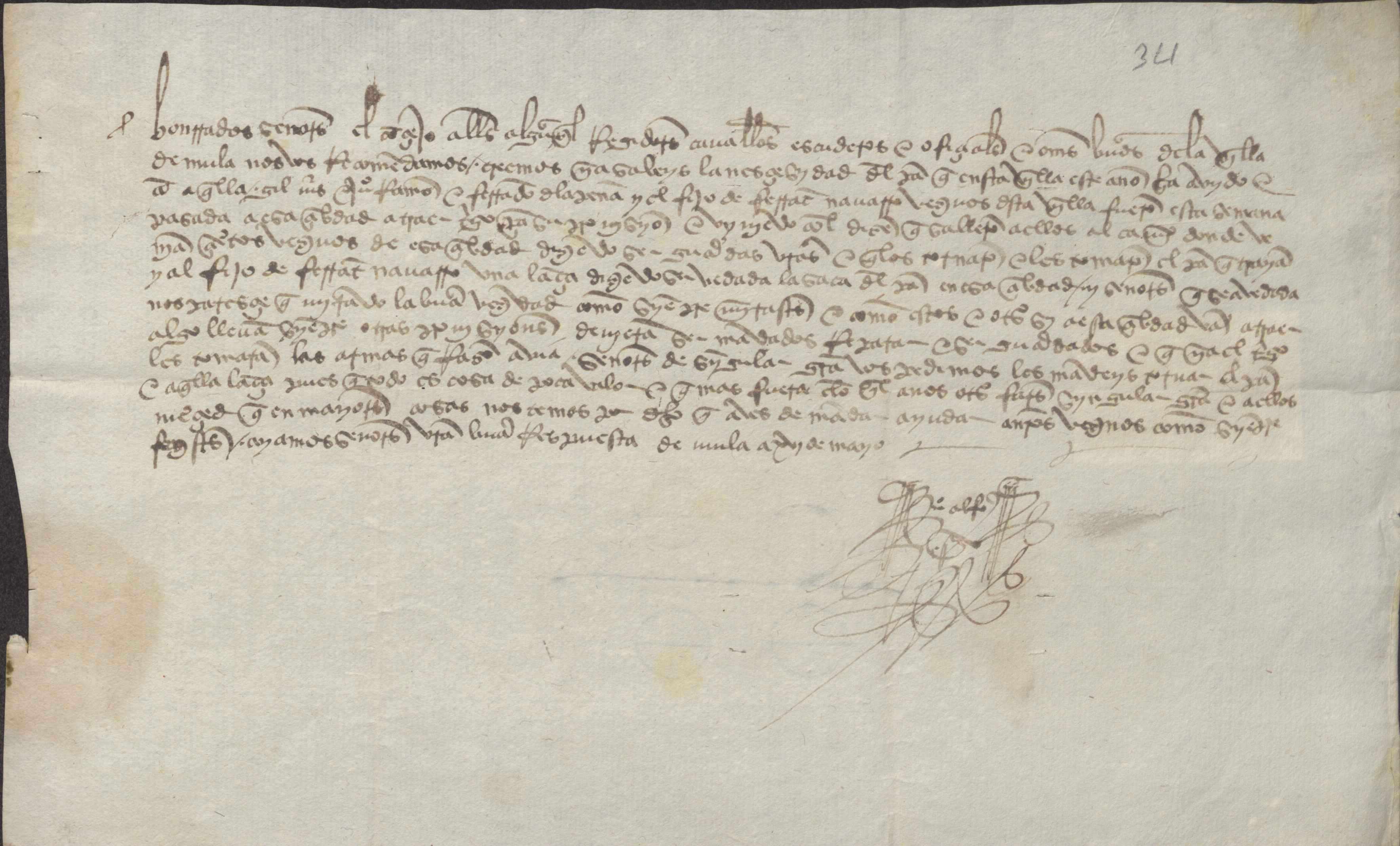 El concejo de Mula solicita al de Murcia que les devuelvan a unos vecinos suyos el trigo que allí habían comprado y una lanza, de uno de ellos, que les habían tomado unos que dijeron ser guardas de la ciudad, alegando que la saca de pan era cosa vedada. Fechado el 16 de mayo.