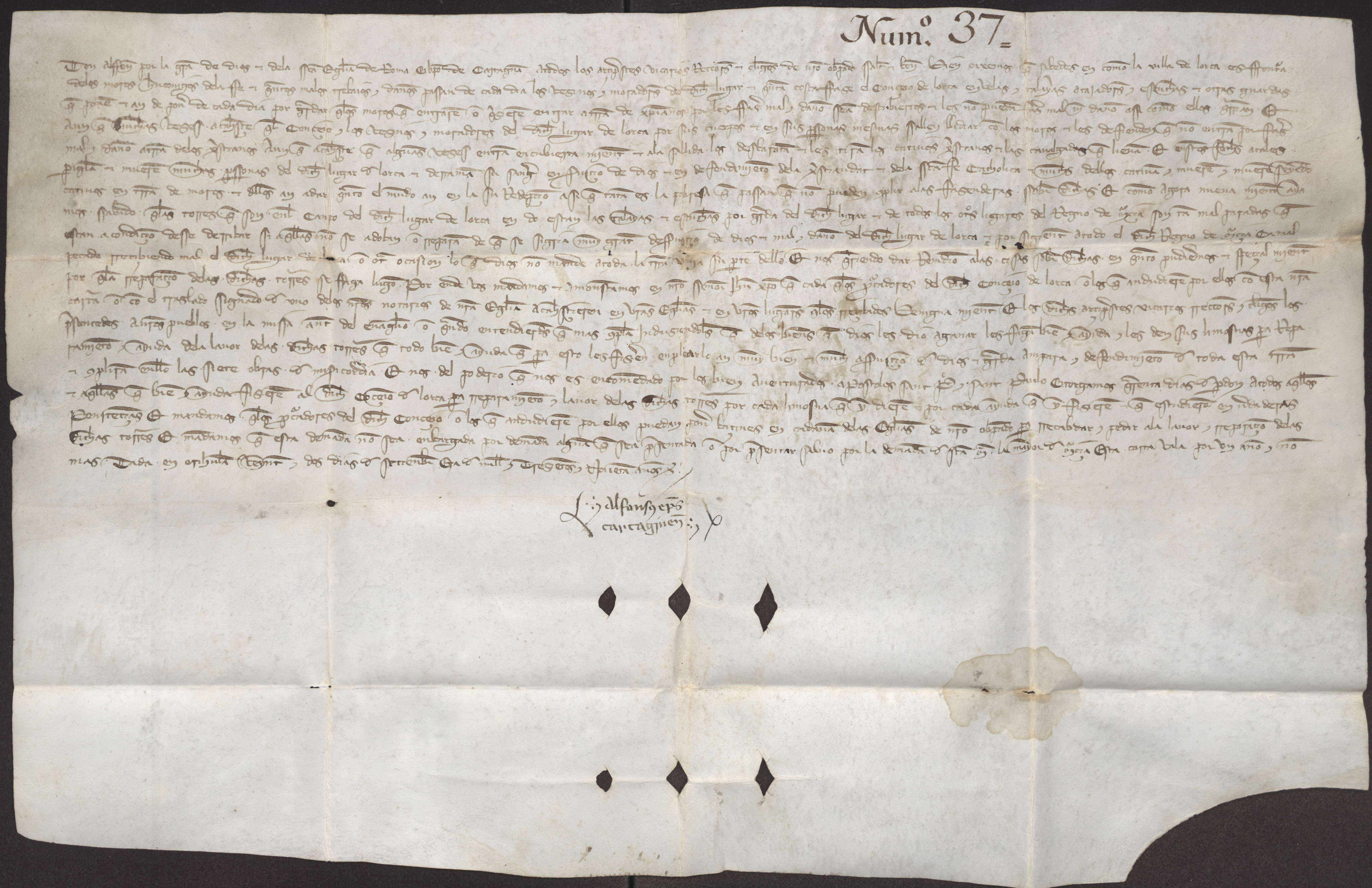 El obispo de Cartagena, Alfonso de Vargas, ordena a los vicarios, rectores y clérigos del obispado que se solicite a los feligreses limosnas para el arreglo de las torres vigías de la frontera con el reino de Granada. Otorga 40 días de perdón por cada limosna o ayuda que se preste.