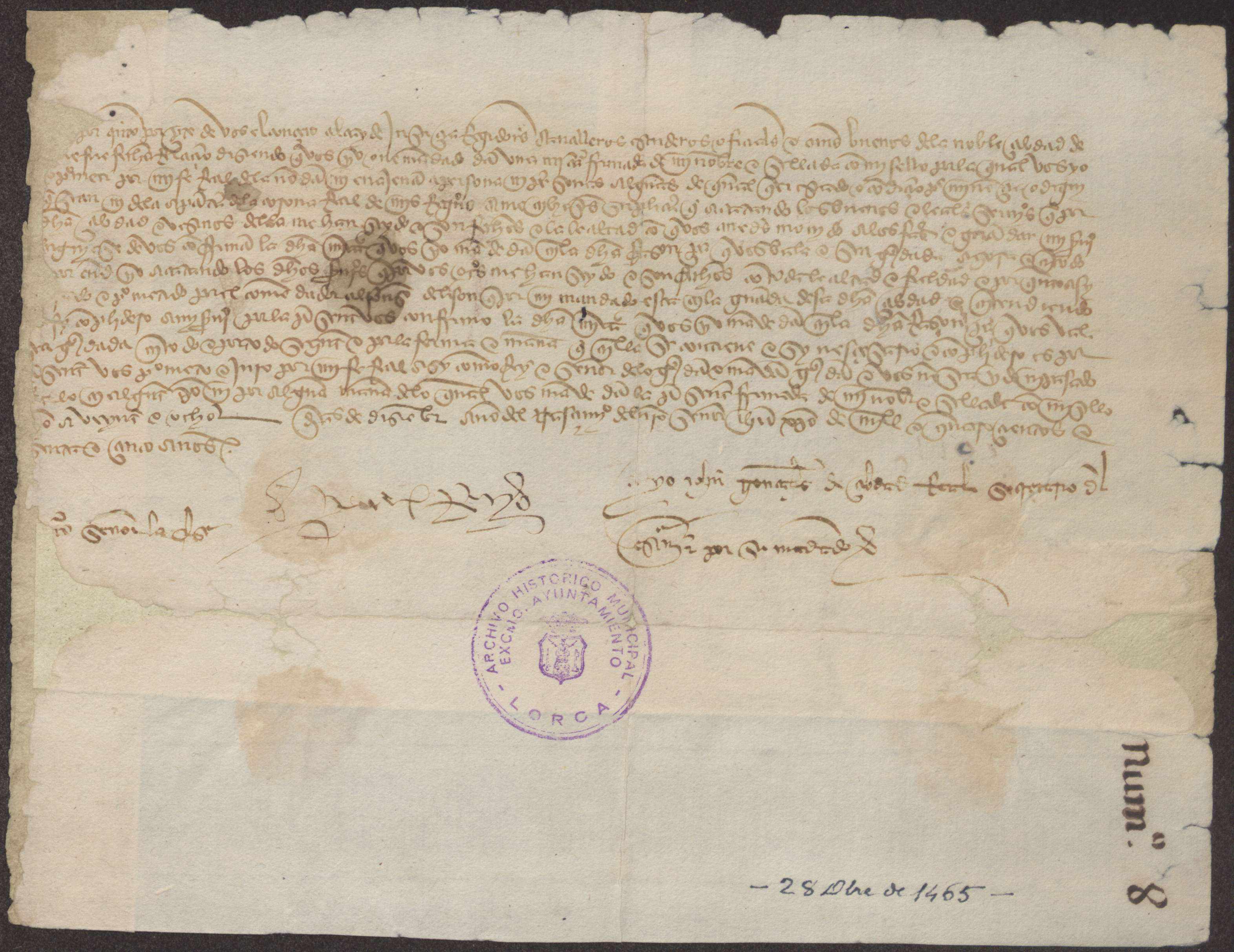 Enrique IV garantiza al concejo de Lorca que esta ciudad nunca sería apartada del realengo por ninguan causa.Documento incompleto, falta la parte derecha.
