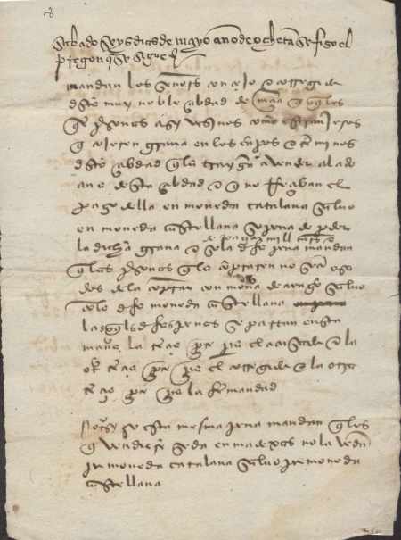 Pregón sobre la obligación de usar moneda castellana en lugar de aragonesa en el comercio de grana y seda, y otras cuestiones.