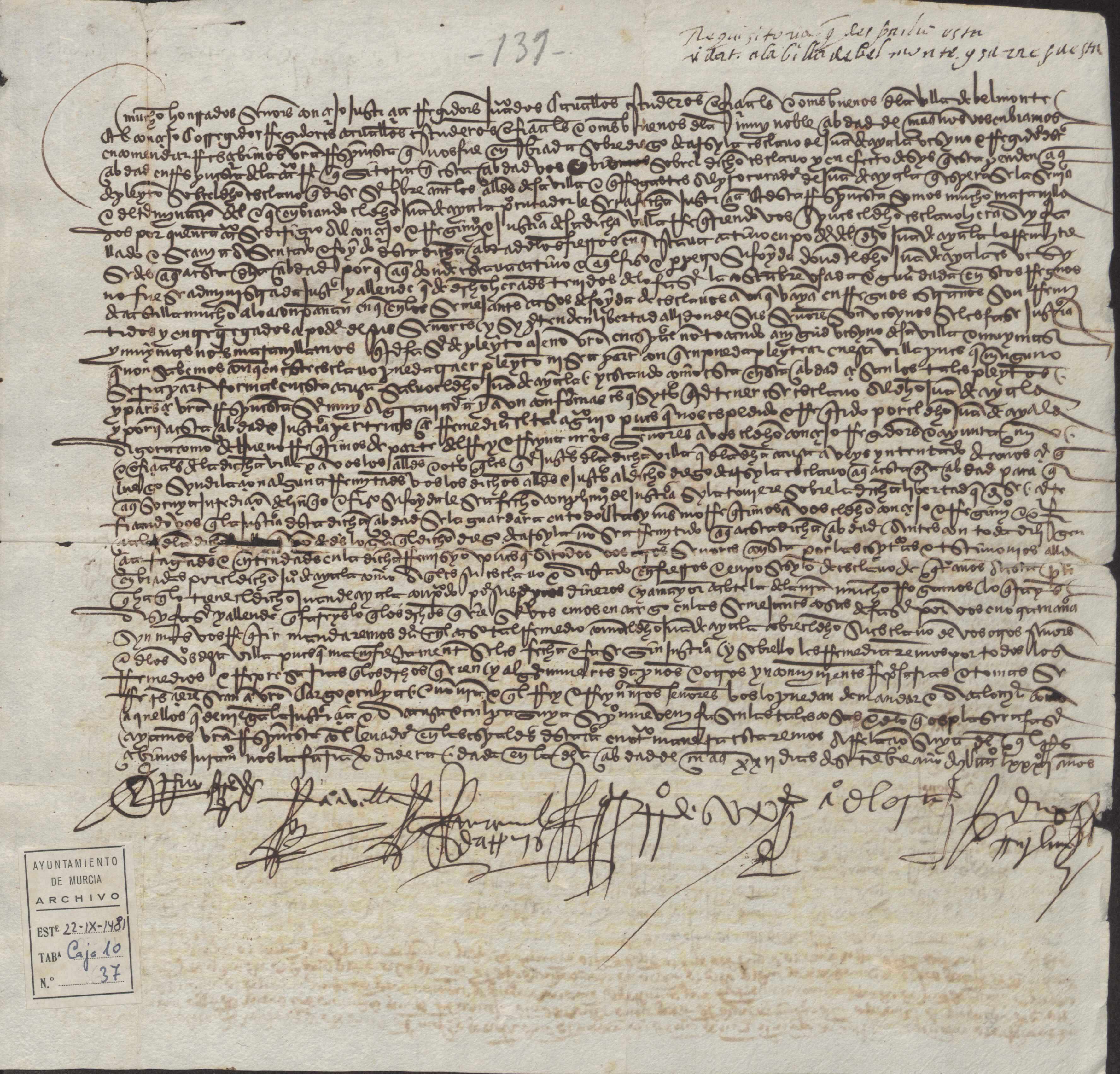 El concejo de Murcia se dirige al de Belmonte para exigir el envío inmediato a Murcia de Diego de Arsila, esclavo propiedad del regidor Juan de Ayala, que había huido a Belmonte y manifestaba ser libre. El concejo de Belmonte estaba retrasando el envío de dicho esclavo, aduciendo que debía llevar a cabo las pesquisas convenientes para verificar que se trataba efectivamente de ese esclavo.