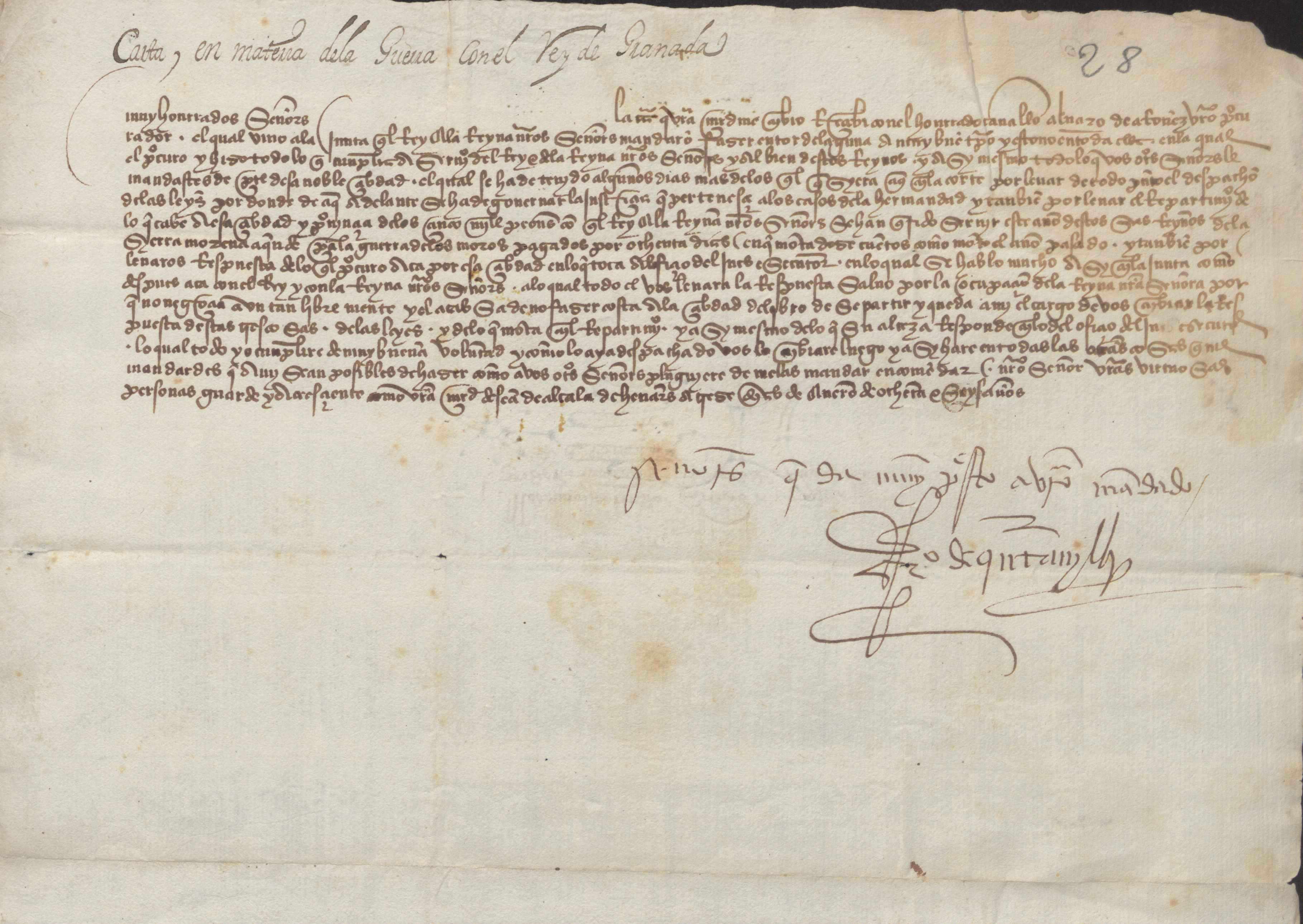 Francisco de Quintanilla informa al concejo sobre la gestiones que realiza su procurador, Alvaro de Arróniz. Comenta que se ha retrasado por dejar resueltos ciertos asuntos: llevar el despacho de las nuevas leyes de la Hermandad, conecer el repartimiento de los 5.000 peones para la guerra de Grananda y el oficio de juez ejecutor. Aclara que no está del todo resuelto por ocupación de la reina y queda en manos sus manos , pues Alvaro de Arróniz ha partido para Murcia para no aumentar los gastos de la ciudad alargando su estancia.