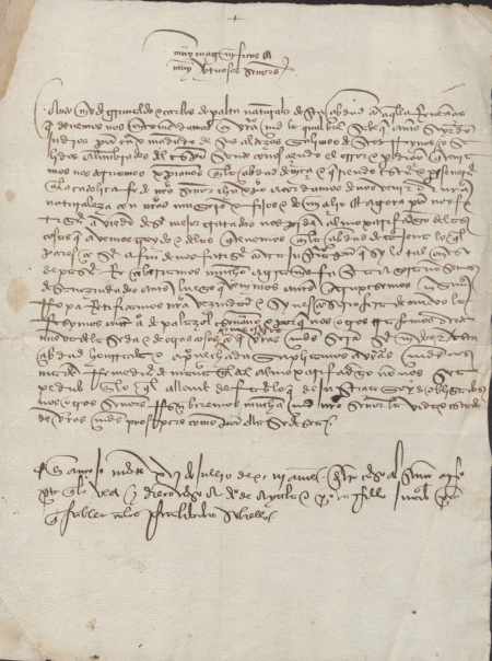 Antonio de Grimaldo y Carlos de Peralta, solicitan al concejo de Murcia que no se les cobre almojarifazgo por las cosas que traen desde Cartagena, al ser vecinos de Murcia. Ellos eran judíos y salieron por orden de los reyes, pero al llegar a Niza se convirtieron al cristianismo y decidieron regresar a sus casas.