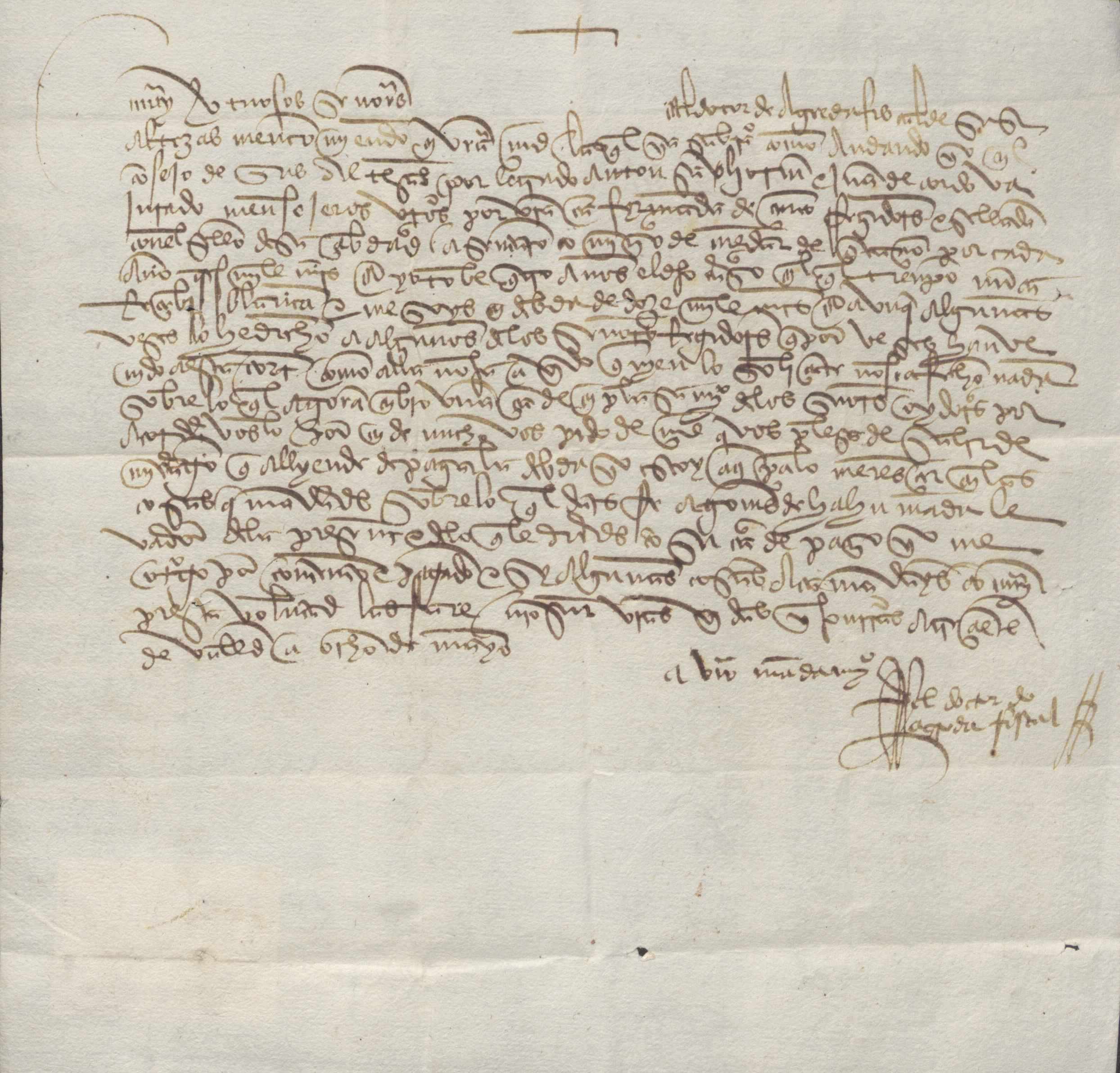 Carta de Fernando Gómez de Ágreda al concejo de Murcia, sobre los 12.000 maravedís que le deben de sus trabajos en la corte como abogado de los pleitos de la ciudad.