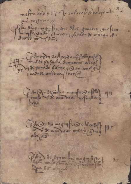 Cuaderno de la mesta correspondiente a 1498, que incluye la relación de diferentes vecinos y el número de cabezas de ganado que poseen. El documento incluye:- Relación de vecinos de fuera de Murcia (Orihuela, Caravaca, Carboneras, Valencia, Cañada del Hoyo, Pajarol, Tragacete, Cofrentes, Villanueva de Alcaraz y Cuenca). Fol. 1r-3r- Relación de vecinos de la ciudad de Murcia. Fol. 3v-6v
