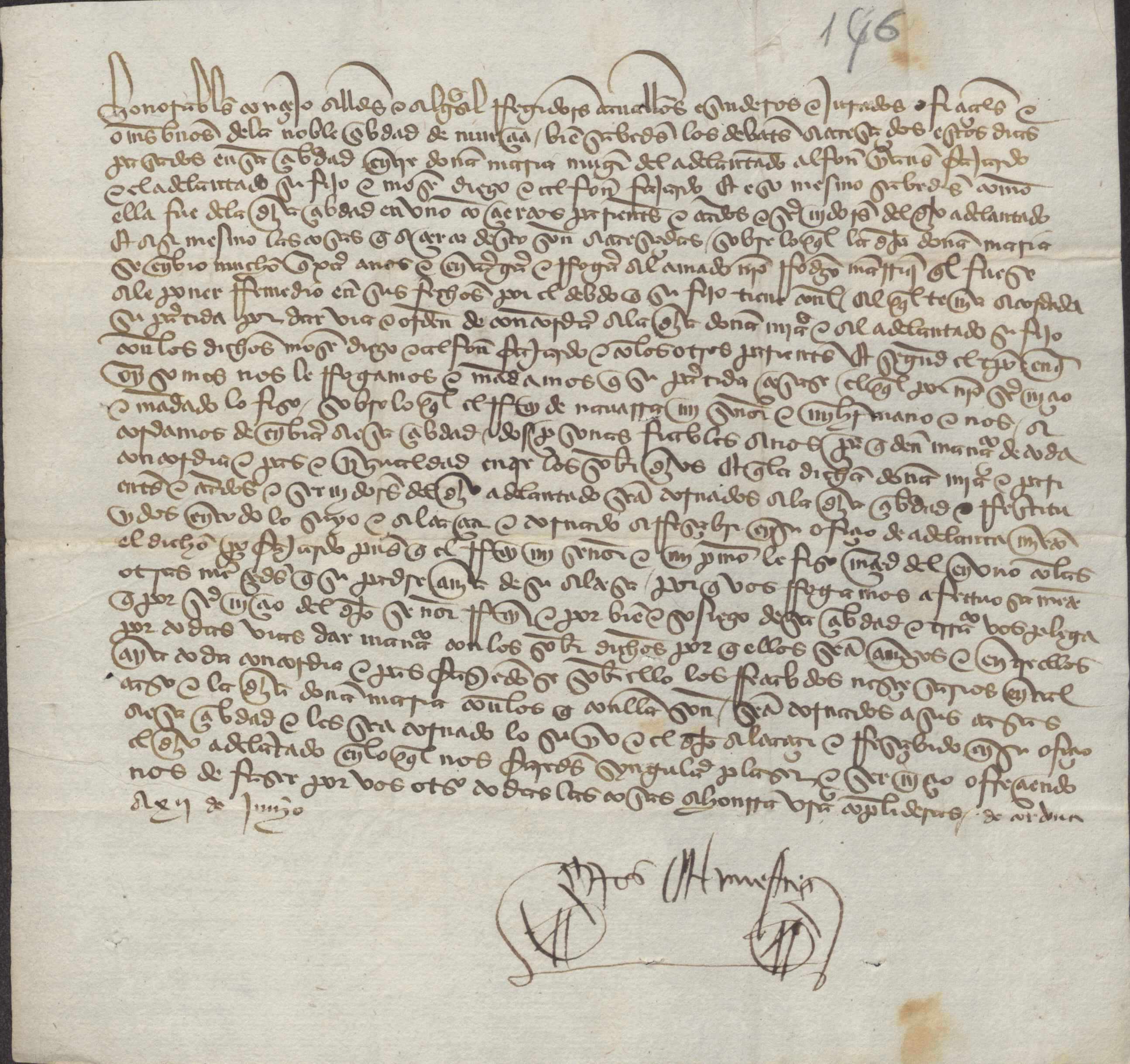 Enrique, Maestre de Santiago, se dirige al concejo de Murcia para que intervenga junto a él en las disputas que existen entre María de Quesada y su hijo el Adelantado Pedro Fajardo con Alfonso y Diego Fajardo, llegándose a una concordia beneficiosa para ambas partes. Fechada el 12 de junio de mediados del s. XV.