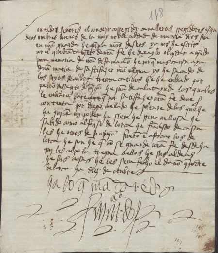 Alfonso Fajardo se dirige al concejo de Murcia para informar de diversas cuestiones acerca de la tregua, entre ellas el quebrantamiento de la misma por parte de Alfonso de Lorca y Francisco de Cascales, o el rescate de treinta cautivos de María de Quesada que se encontraban presos en Albox. Fechada el 10 de octubre.