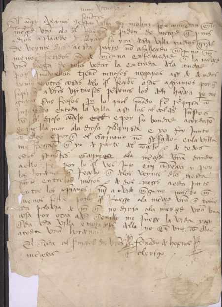 Fernando de Orenes, clérigo de Molina de Segura, se dirige al concejo de Murcia para asegurar que desde hace 20 días no ha habido ningún muerto ni herido a causa de la peste, por lo que la ciudad solicita licencia para que sus vecinos puedan entrar libremente en Murcia a ocuparse de sus negocios, lo cual se les había prohibido a causa de la peste.