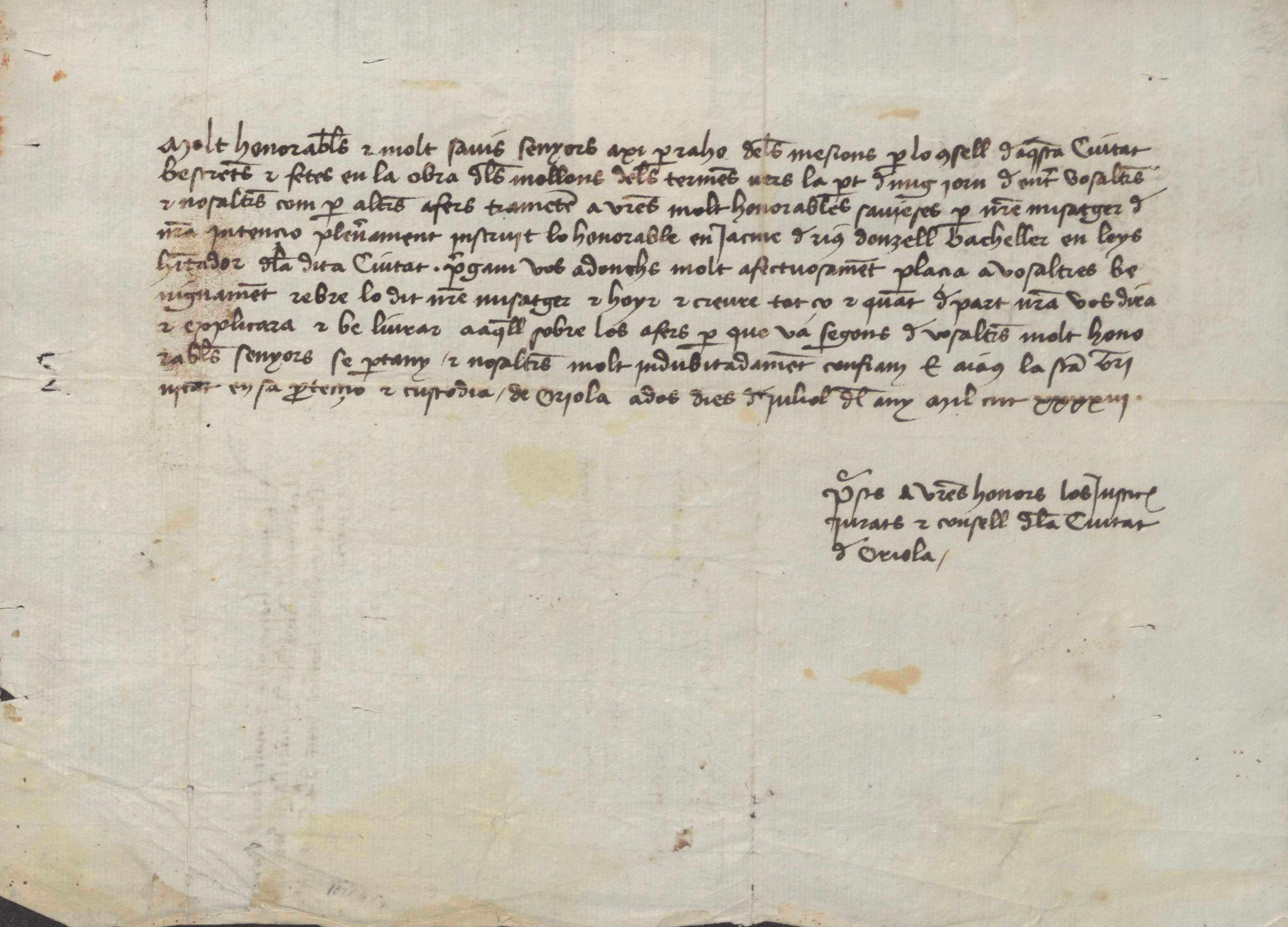 El concejo de Orihuela pide al concejo de Murcia que den fe y creencia a su mensajero, Jaime de Rius, que llegará próximamente a Murcia para tratar ciertos asuntos relativos a los mojones que separan ambos términos.