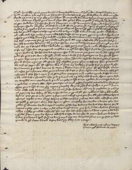 El concejo de Orihuela se dirige al de Murcia para responder a su petición de que enviasen a Murcia gentes a pie y a caballo, y de poder llevar el ganado de Murcia a Orihuela, con motivo de los enfrentamientos que tienen con el Adelantado y su madre. Respecto al envío de soldados, manifiestan que es imposible, pues han sido avisados por el rey de Navarra que Castilla tiene pensamiento de atacar el Reino de Aragón, por lo que han de contar con efectivos militares. Sí permiten el envío de ganado de ciertos vecinos de Murcia a Orihuela, pagando por ello los derechos correspondientes.