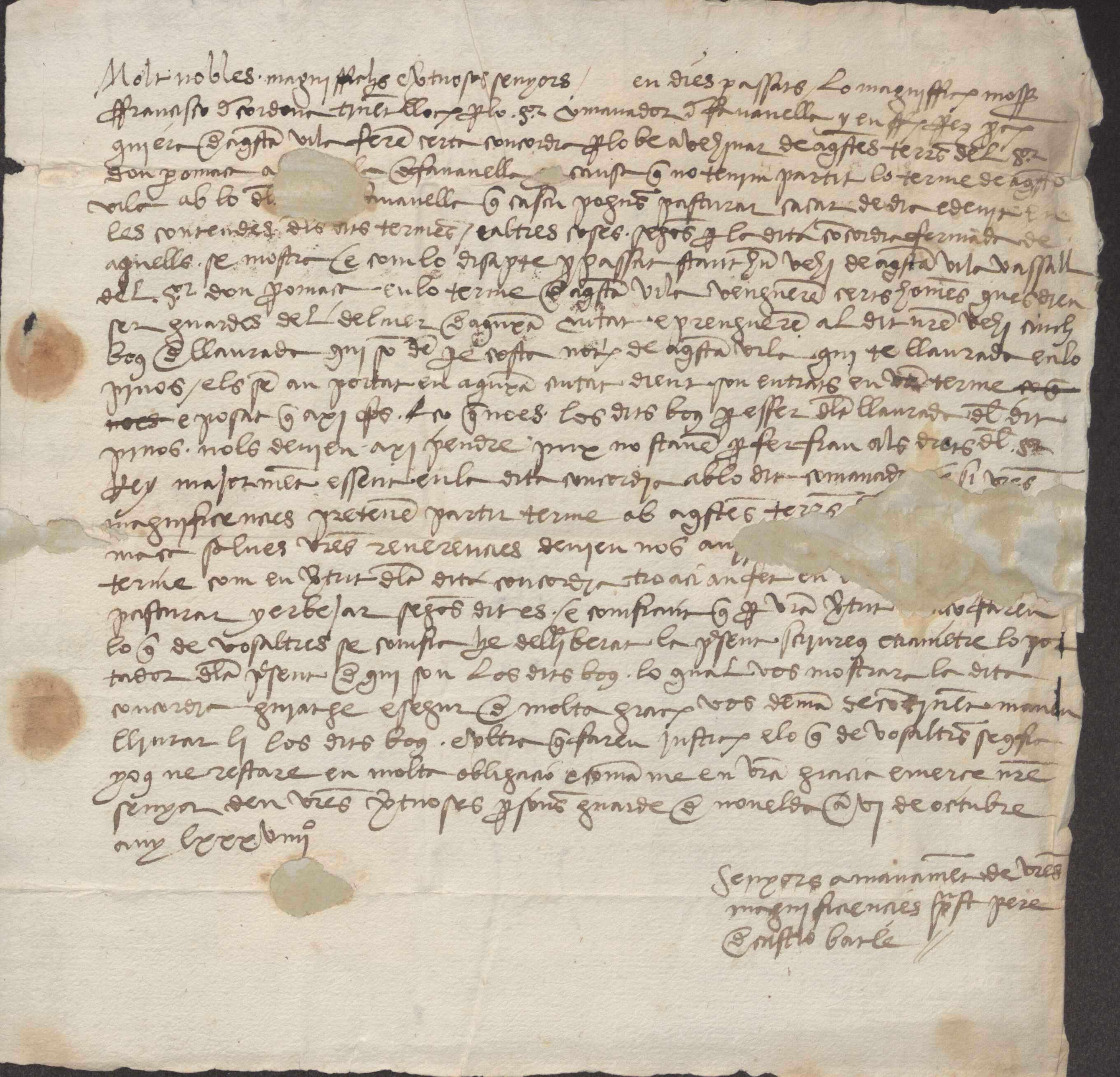 Carta del bayle Pedro de Castro al concejo de Murcia, solicitando devuelvan a Pere Costa cinco cabras de su propiedad.