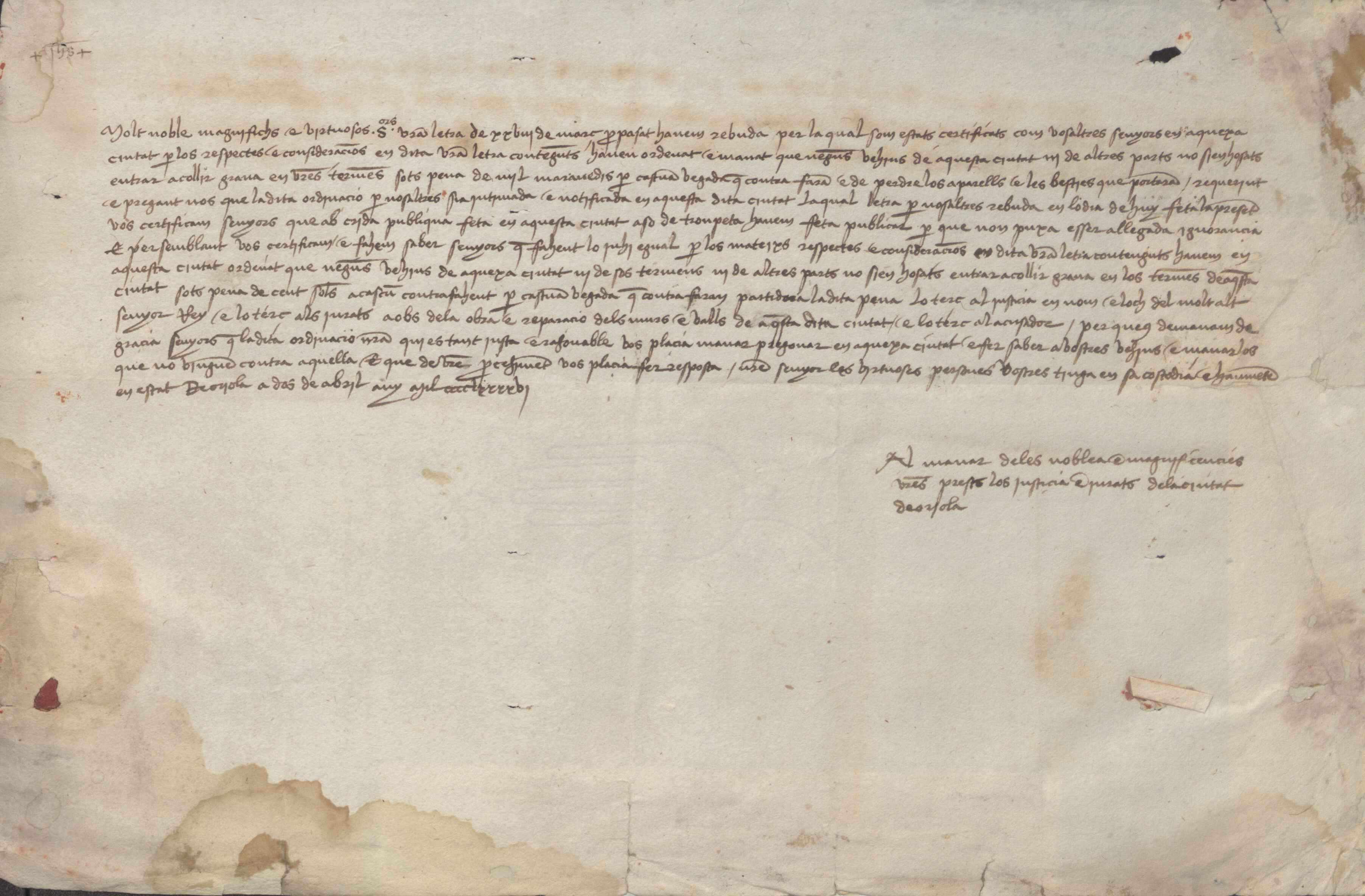 El concejo de Orihuela comunica al concejo de Murcia que ha recibido y ha mandado pregonar la carta que les enviaron en la cual prohibían a los vecinos de Orihuela y de otros lugares entrar en término de Murcia a coger grana. Solicitan que los vecinos de Murcia tampoco puedan entrar en Orihuela a coger grana y que su carta sea pregonada públicamente.
