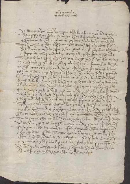 Petición de Álvaro de Villamaña al concejo de Murcia, solicitando le declaren libre de pagar dos espadas que se le exigen injustamente.