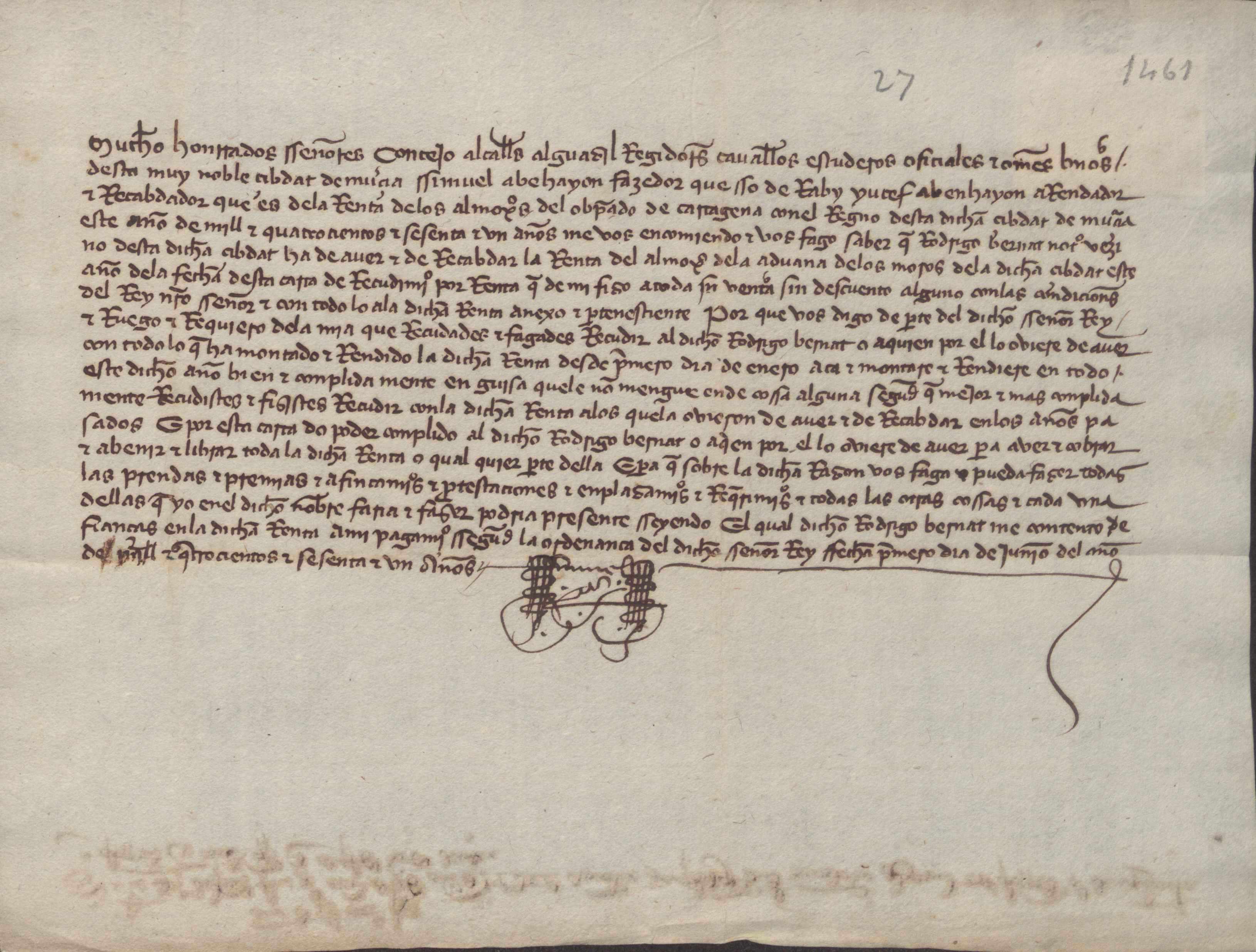 Carta de Samuel Aben Yahio al concejo de Murcia, comunicando el arrendamiento por Rodrigo Bernat de la mitad de la renta de la alcabala de la aduana de los moros.