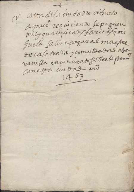 - Carta del concejo de Murcia al concejo de Orihuela, reclamando el pago de 72.000 maravedís que debe Orihuela al maestre de Calatrava y Comendador de Abanilla, de un total de 144.000 maravedís en concepto de talas y otros daños causados en Abanilla. Murcia se puso por fiadora de Orihuela de ese dinero y por ello exige el pago. (1463-04-11. Murcia). Fol. 1r-v
