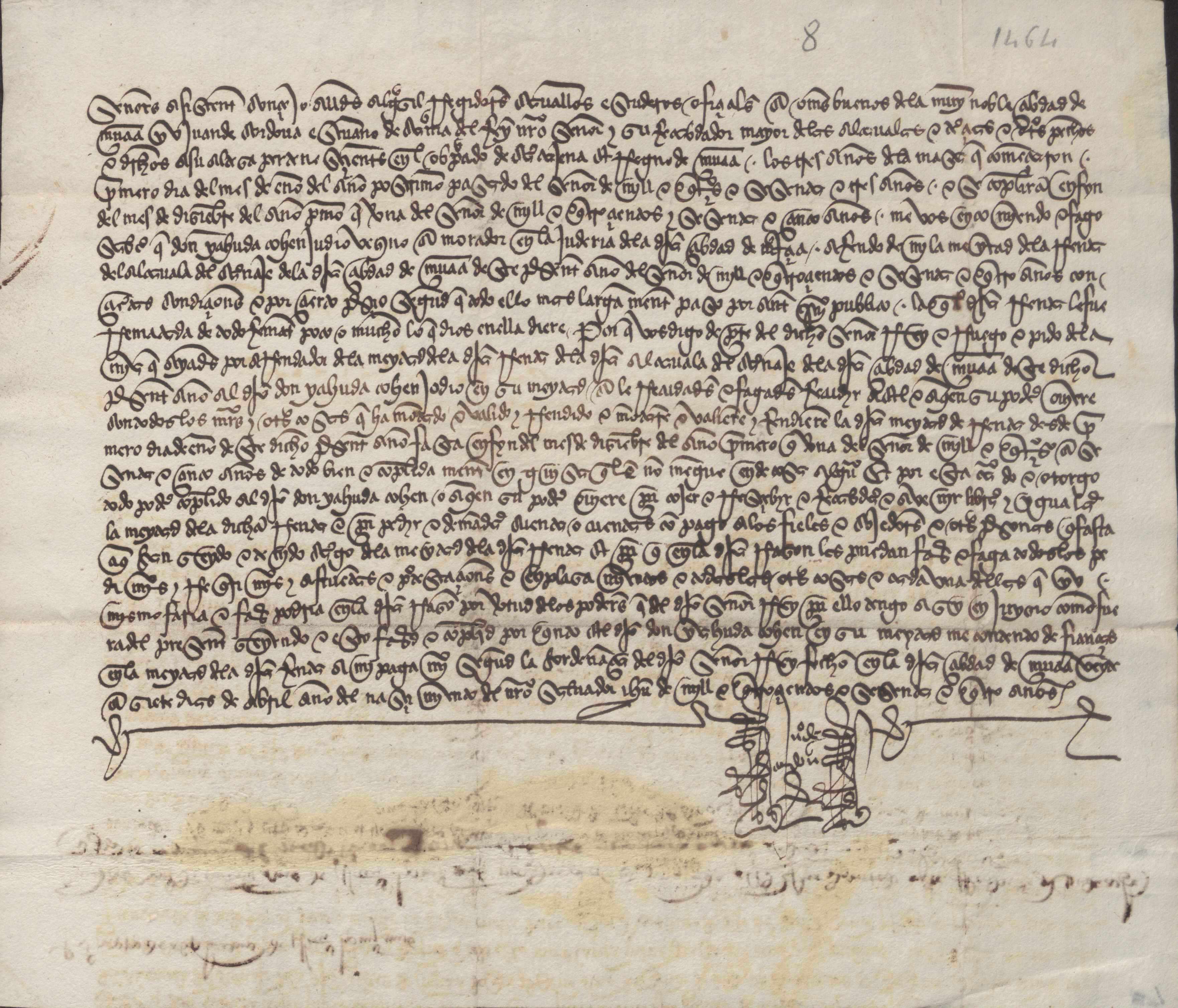 Juan de Córdoba, recaudador mayor de las alcabalas y tercias del Obispado de Cartagena, comunica al concejo de Murcia que Yahuda Cohen ha quedado por arrendador de la mitad de la alcabala del carnaje de la ciudad de Murcia para el año 1464. Pide que sea aceptado como tal y le da poder para que pueda recaudar la dicha renta.