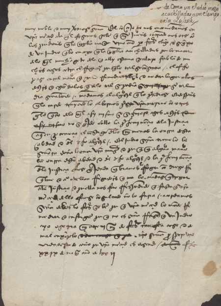 El concejo de Murcia se dirige al Adelantado Pedro Fajardo para solicitarle que devuelva un judío que intentó matar a cuchilladas en la Iglesia Mayor al clérigo Pedro Fernández, para que sea juzgado por la justicia de la ciudad. Éste fue prendido por el alguacil, pero fue requisado por el merino del Adelantado y entregado a la mujer de éste.