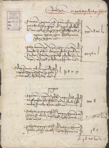 Cuentas de los gastos del repartimiento de 300 peones en las parroquias de Murcia para la guerra de Granada.