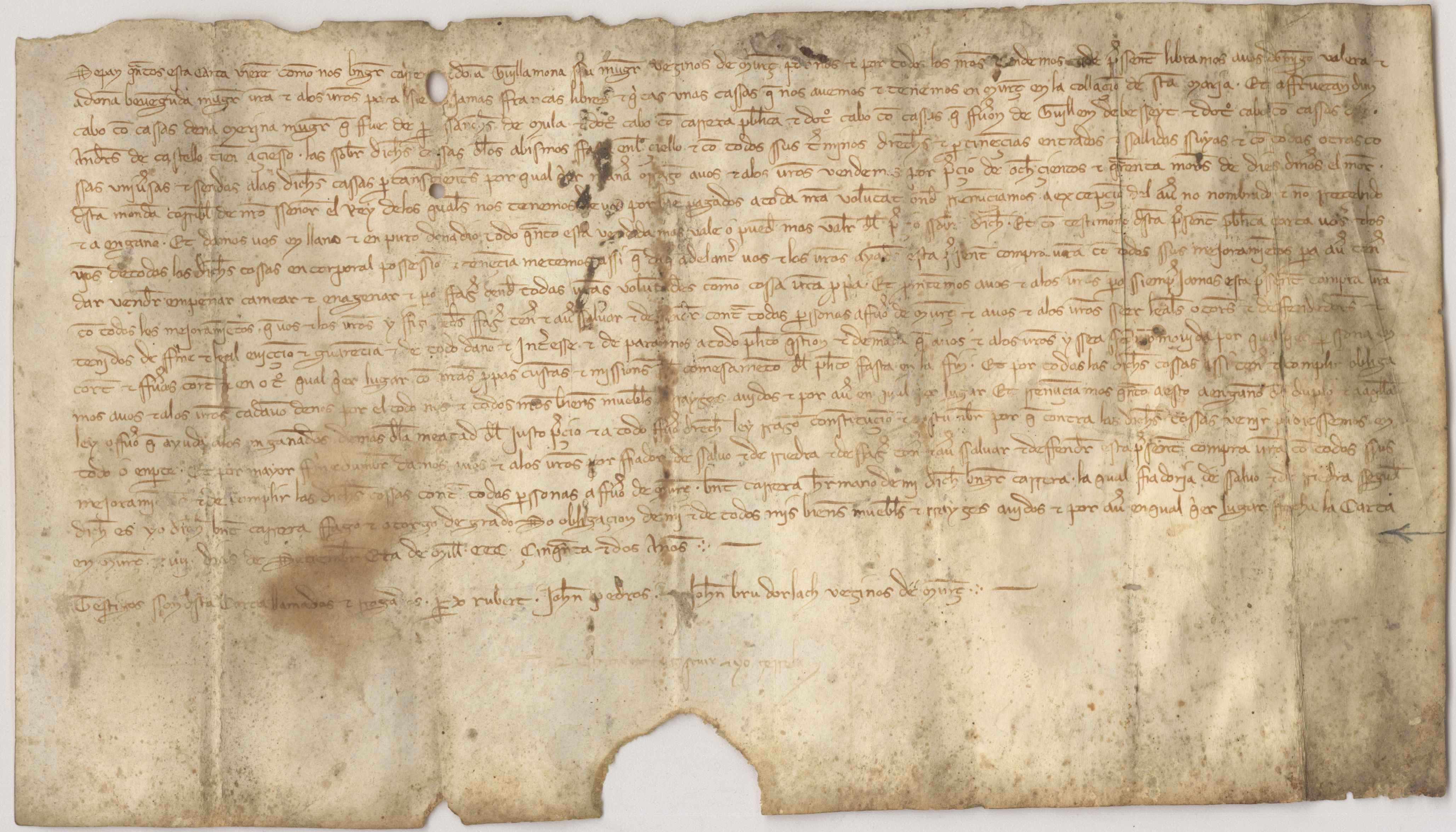 Carta de venta de Berenguer Carrera y Doña Guillamona a favor de Domingo Valero y doña Benvenguda, de unas casas en la parroquia de Santa María de Murcia.