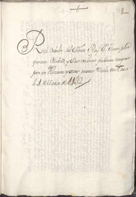 Juan II, ante las quejas del concejo de Murcia, ordena a los cencejos de Alcaraz, Alcazar de Consuegra y todos los lugares del Campo de Montiel que permitan a los vecinos de Murcia, aun en contra de cualquier ordenanza, comprar grano y llevarlo sin pena alguna a Murcia, donde hay carestía, con la única condición de que el cereal no salga de Castilla.