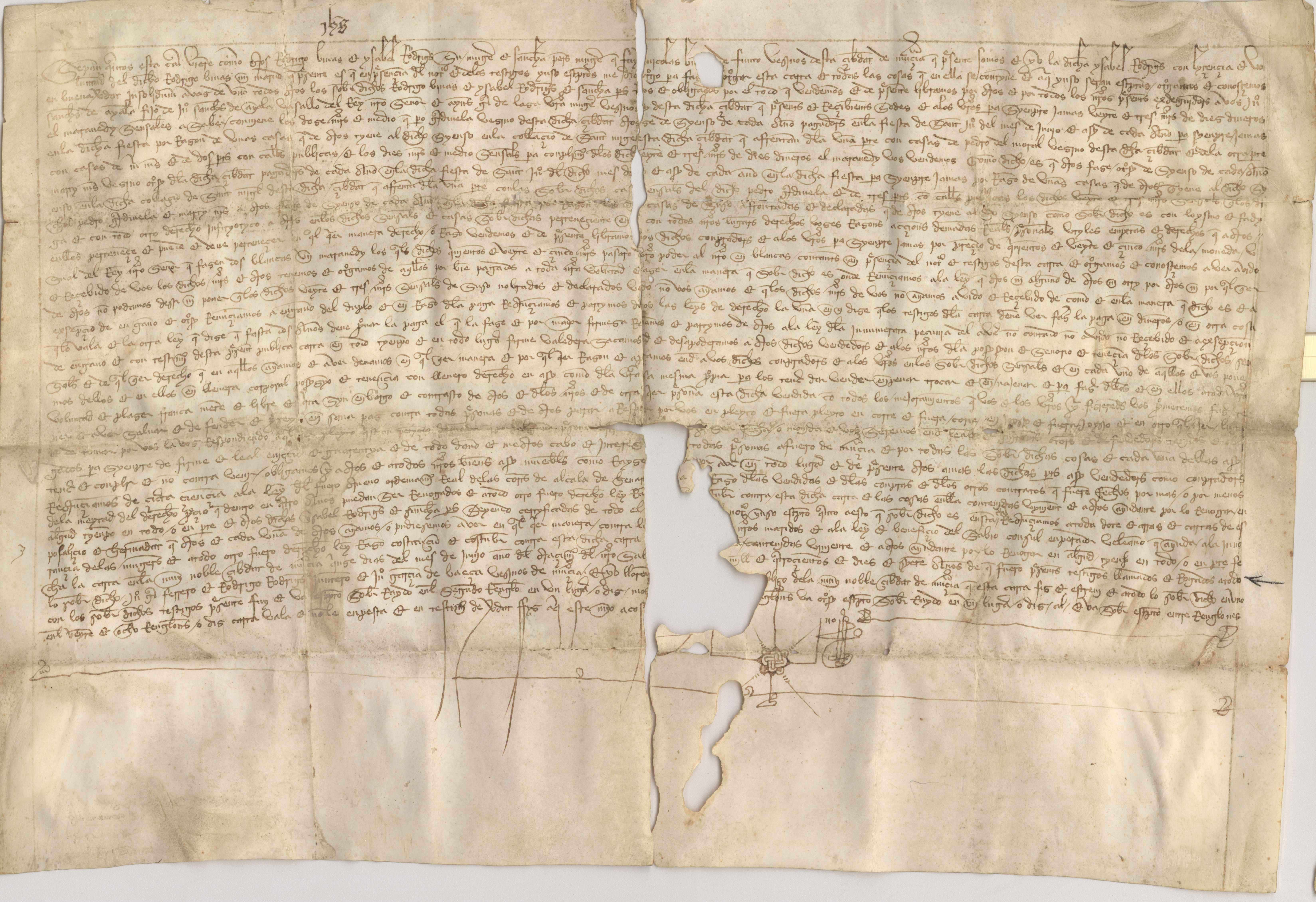 Carta de venta otorgada por Rodrigo Bivas y otros vecinos de Murcia a favor de Juan Sánchez de Ayala e Inés García de Laza, de ciertos censos sobre unas casas situadas en Murcia.