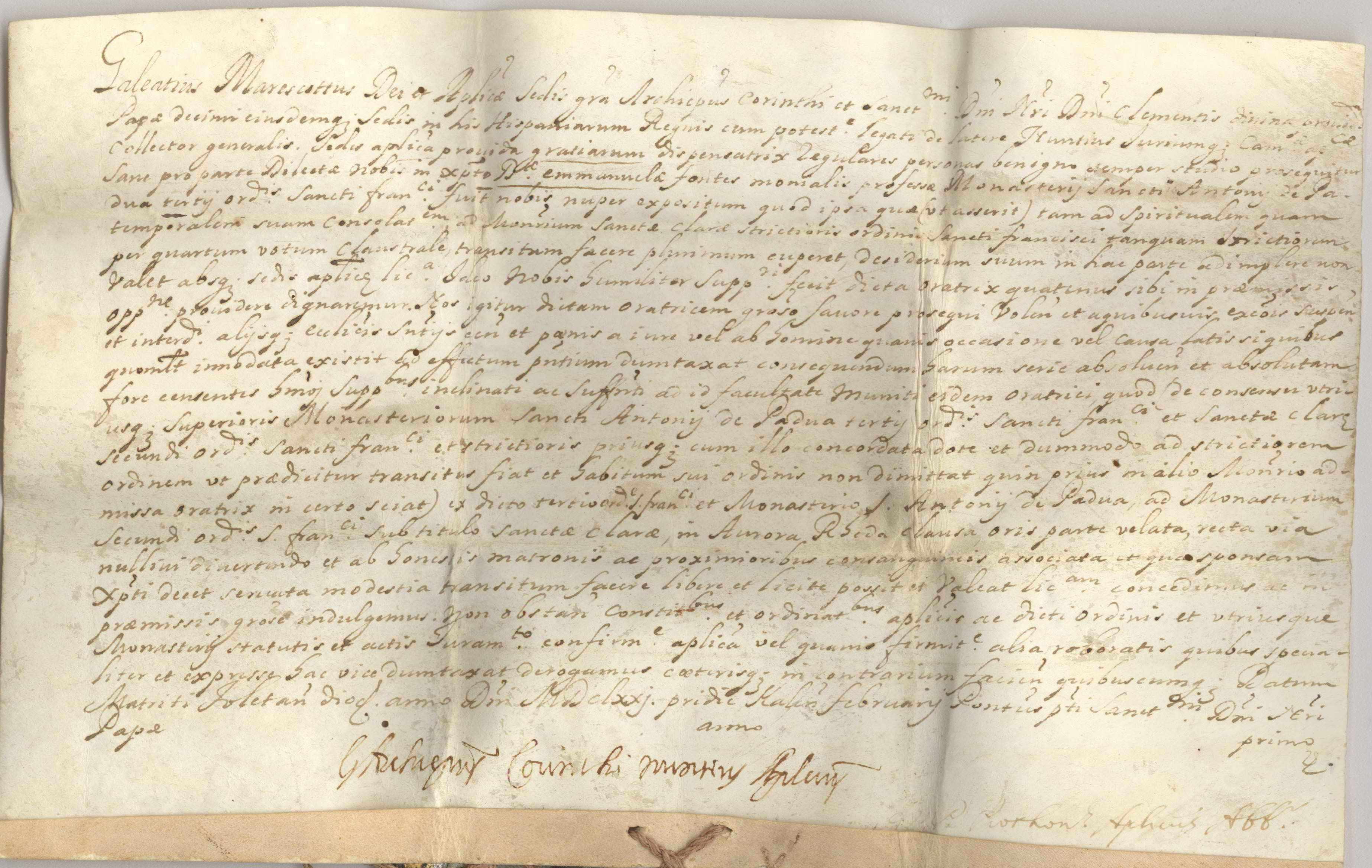 Licencia de Galeatius Marescotus, nuncio apostolico de Clemente X, a Manuela Fontes, seglar en el monasterio de San Antonio de Padua en Murcia, para que pueda pasar de la 3ª Orden de San Francisco a la 2ª Orden, y pueda ser monja en el monasterio de Santa Clara de Murcia.