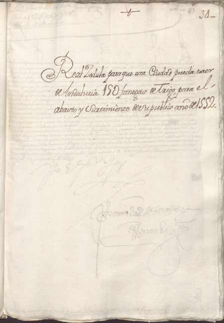 Cédula del príncipe Felipe autorizando la saca de cereales por los puertos de Andalucía para abastecer a la ciudad de Murcia