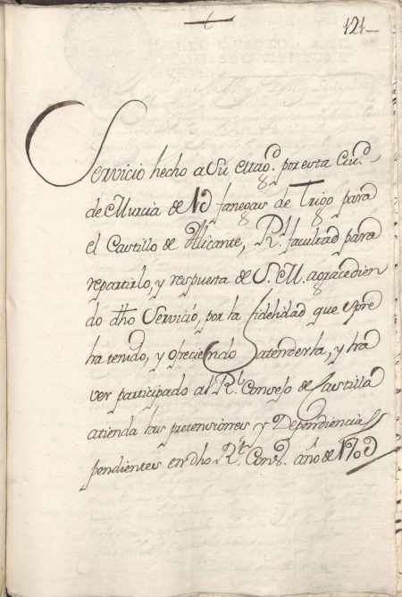Expediente sobre el servicio prestado por el concejo de Murcia a Felipe V al hacer entrega de 1000 fanegas de trigo para proveer de víveres el castillo de Alicante.