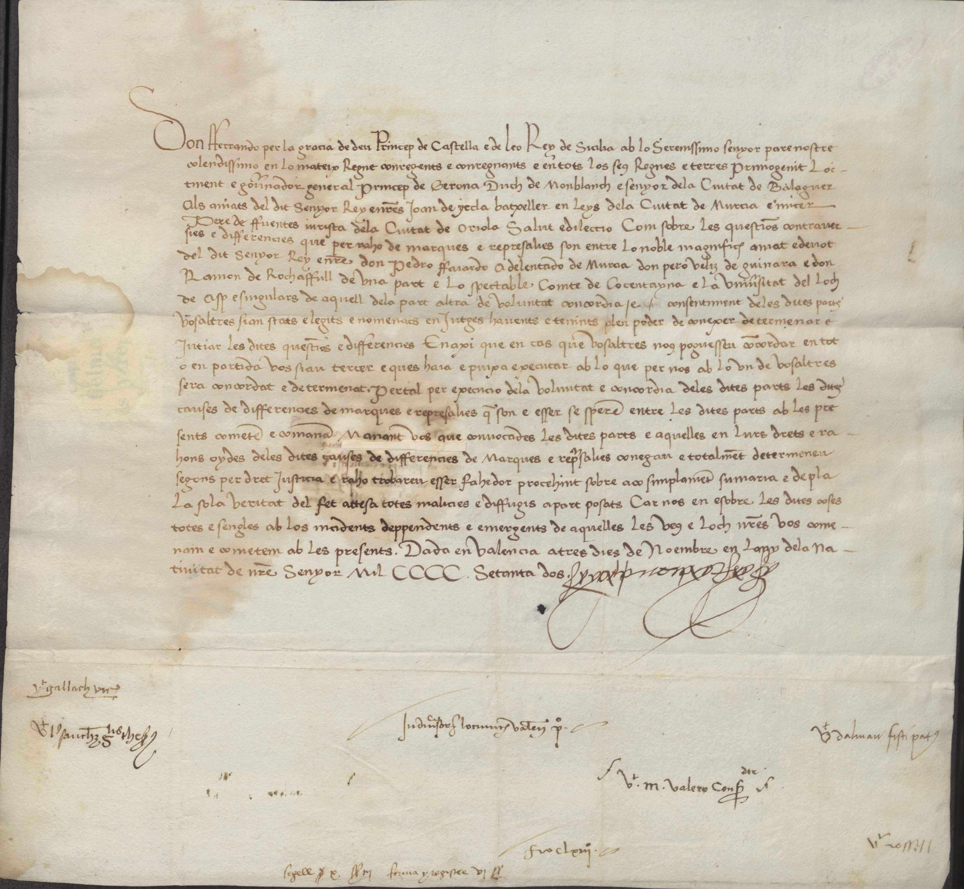 Fernando el Católico nombra a Juan de Yecla, bachiller en leyes de la ciudad de Murcia, y a Pedro de Fuentes, jurista de Orihuela, como encargados de dirimir los pleitos que tienen Pedro Fajardo, Pedro Vélez de Guevara y Ramón de Rocafull con el Conde de Cocentaina.