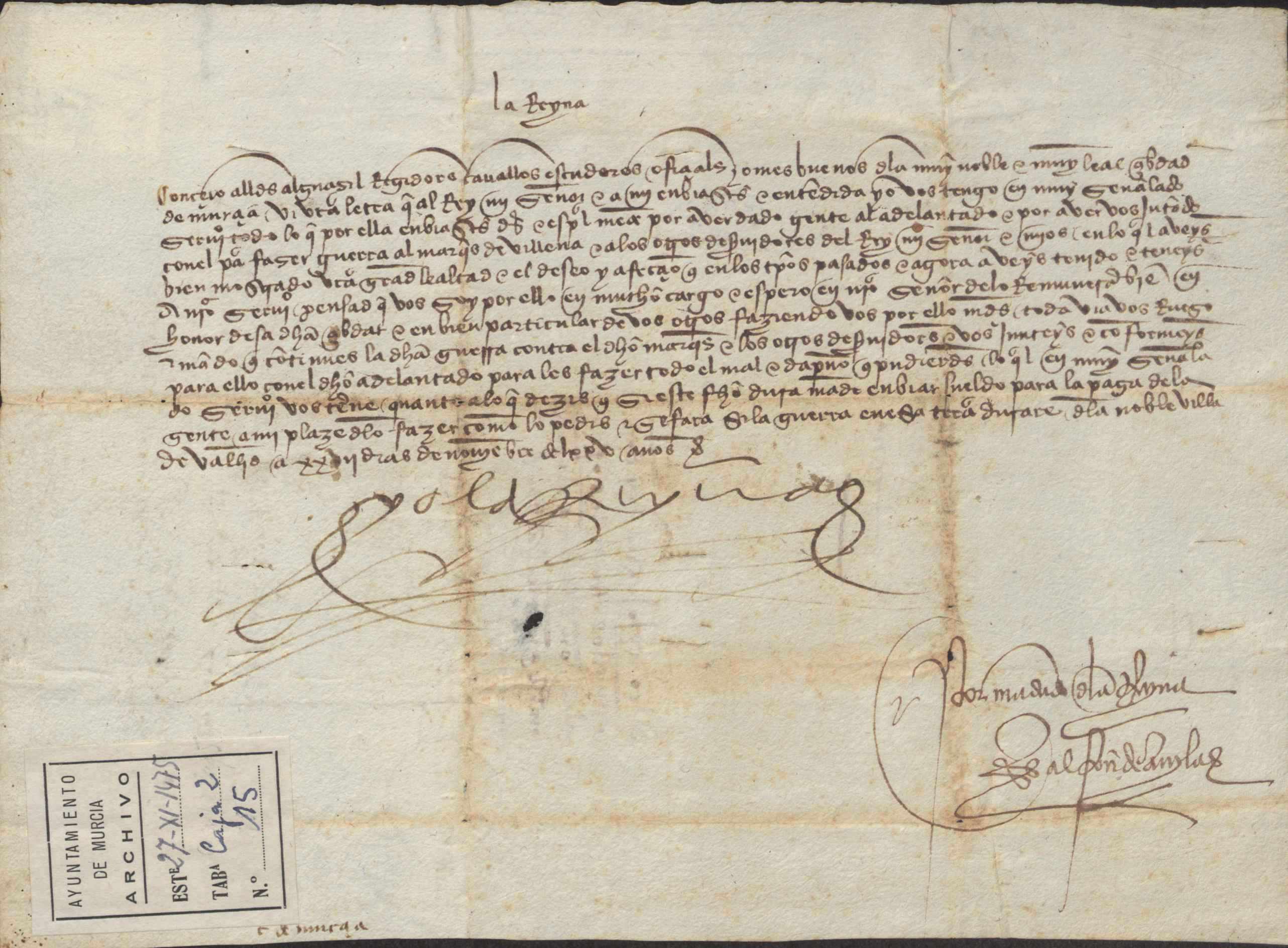 Carta misiva de la Isabel la Católica para que se pague el sueldo a la gente de Murcia si prosigue la guerra en el marquesado de Villena.