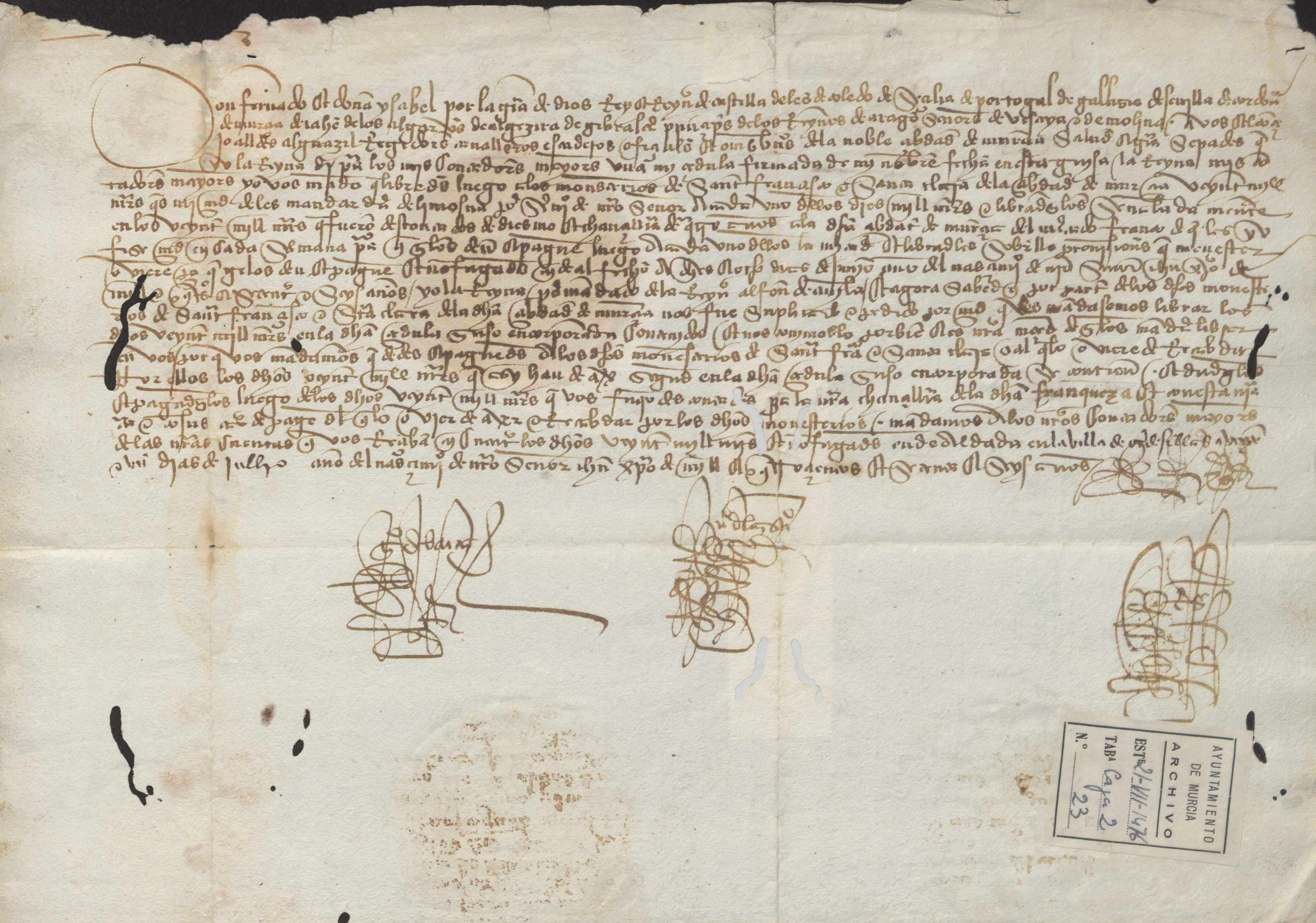Los Reyes Católicos ordenan el cumplimiento de una cédula de la reina, insertada (1476-06-18), por la cual mandaba al concejo dar a los monasterios de San Francisco y Santa Clara de la ciudad de Murcia 10.000 maravedís a cada uno, provenientes de la cantidad que habría de haberse pagado de los diezmos reales en los cuatro años anteriores.