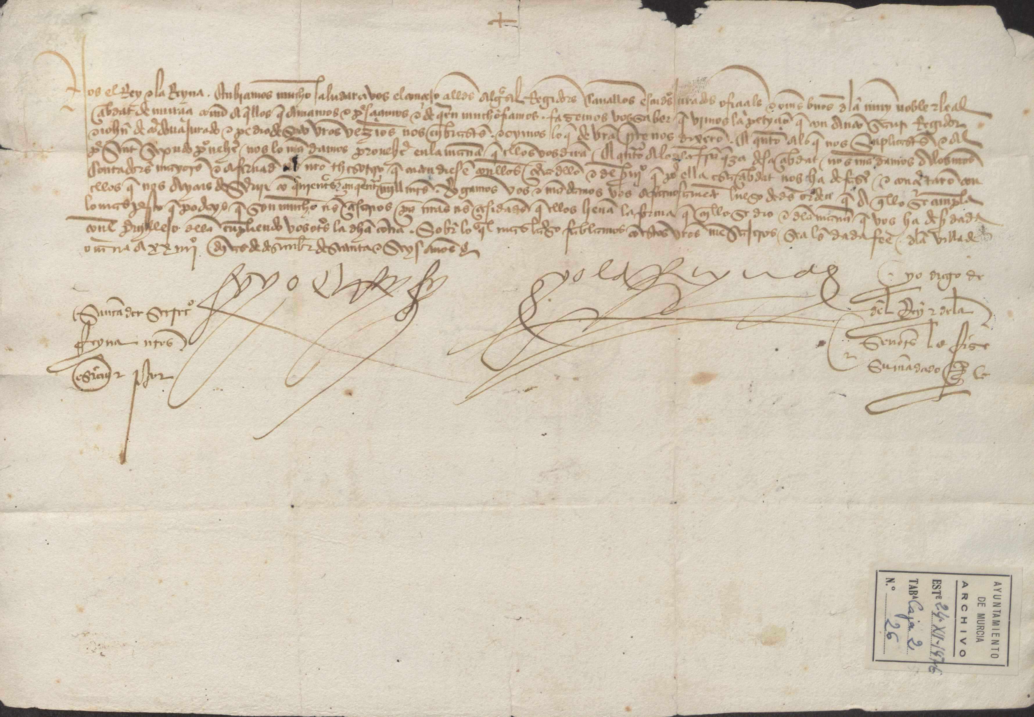 Carta misiva de los Reyes Católicos al concejo de Murcia notificando el acuerdo con los procuradores de Murcia sobre el pago de pedidos y monedas.