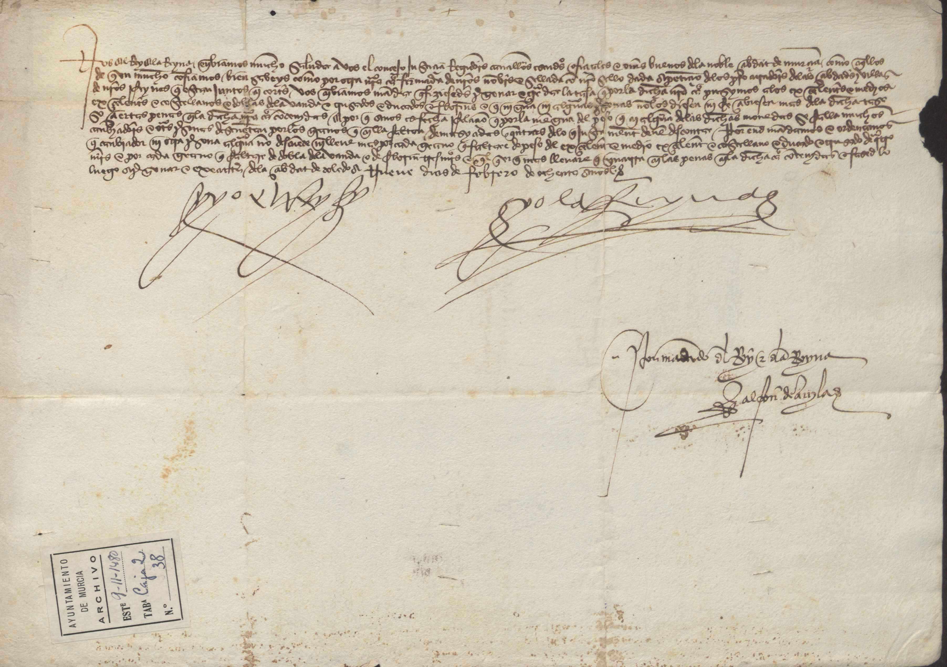 Carta misiva de los Reyes Católicos a la ciudad de Murcia sobre el cambio, peso y ley de las monedas.